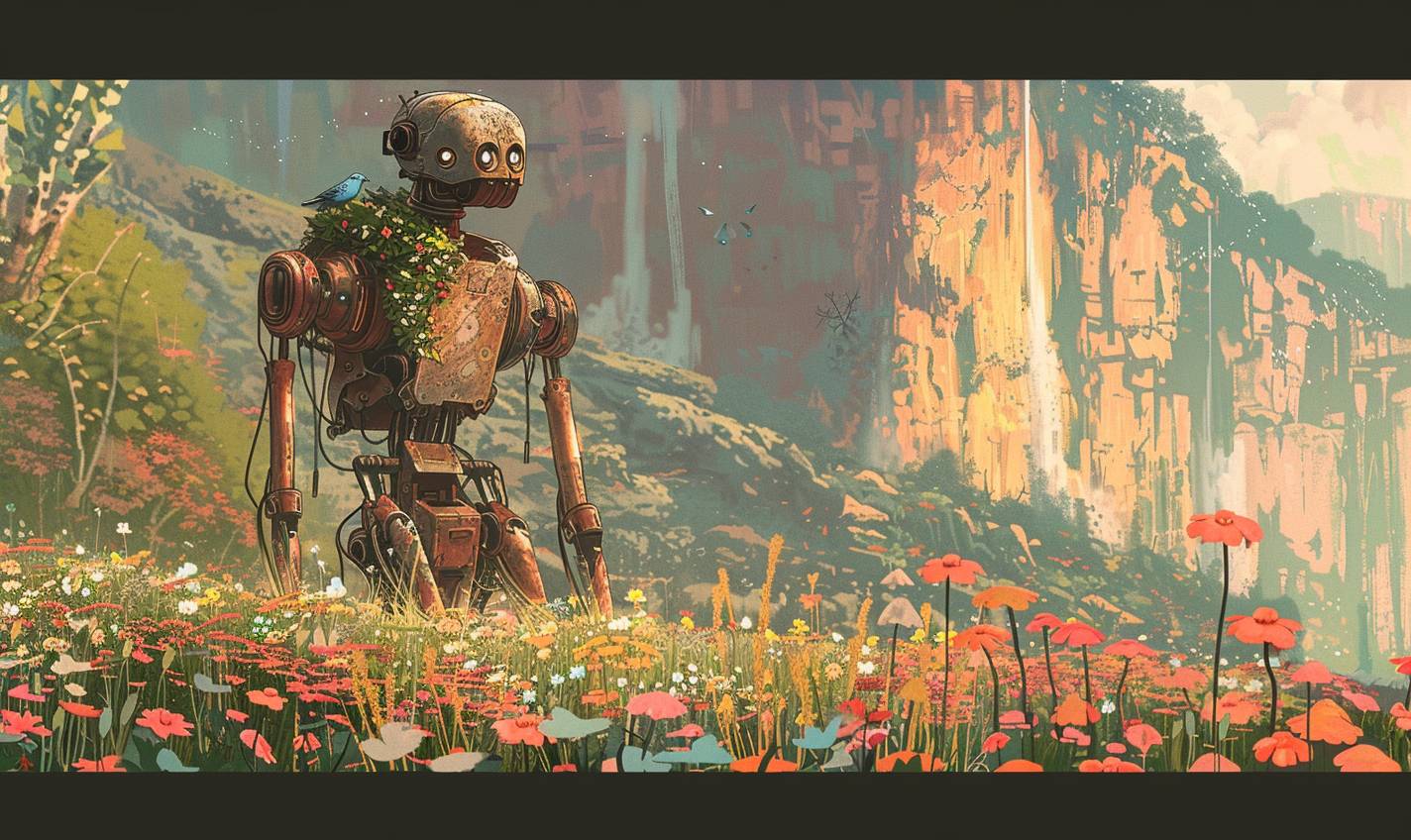 一台古老的木制机器人被开花的藤蔓覆盖,手中栖息着一只小蓝鸟,静静地伫立在野花盛开的草地上,背后是一个巨大的瀑布悬崖。