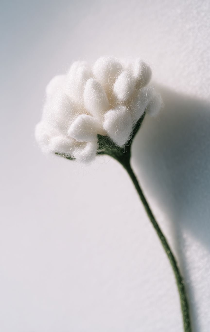 a white flower made of wool, with a green stem, against a white background, photographed in the style of viviane sassen, with soft light, high-key lighting, and a close-up shot, using a canon eos r5. --ar 81:128 --v 7.0