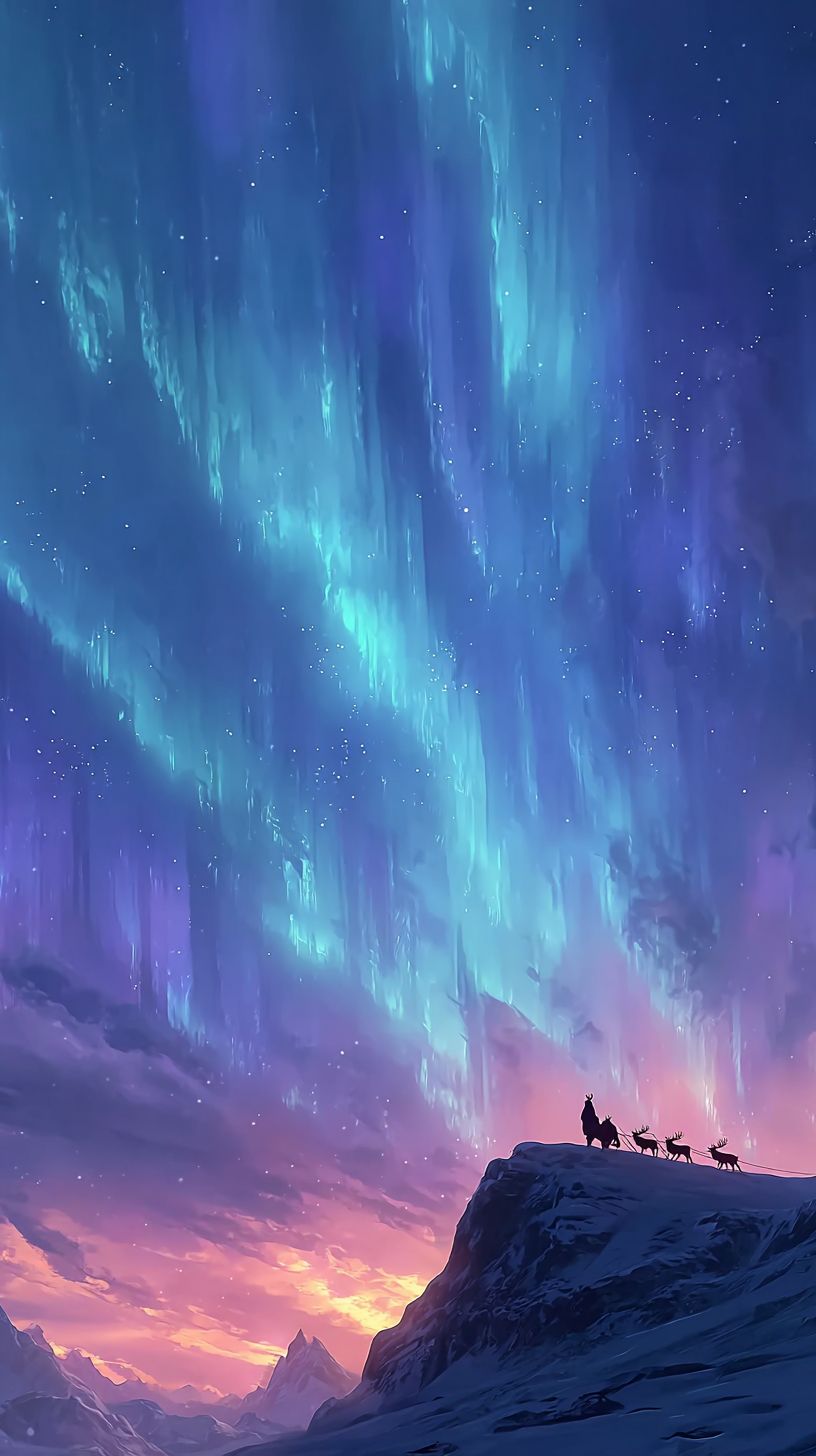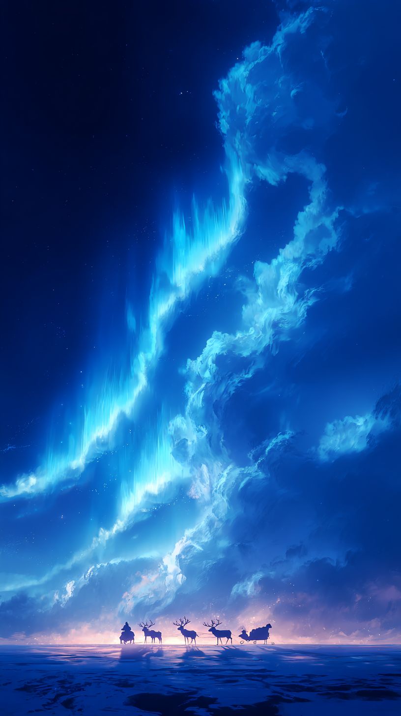 Anime style, ultra high resolution 4K, professional detailed artwork, high-resolution natural landscape, breathtakingly beautiful scene, masterful composition, detailed lighting, vibrant colors, very mystical and ethereal atmosphere, faint silhouette of Santa Claus crossing the aurora sky, massive aurora curtain in the polar night sky, tiny silhouette of reindeer and sleigh crossing the light, upward-gazing composition, grandeur of nature and miraculous extraordinary moment, high Luminosity and color gradation, mystical polar night, quiet awe --ar 9:16 --v 7.0