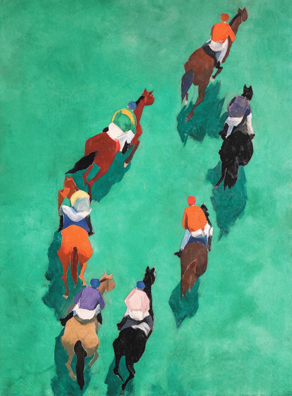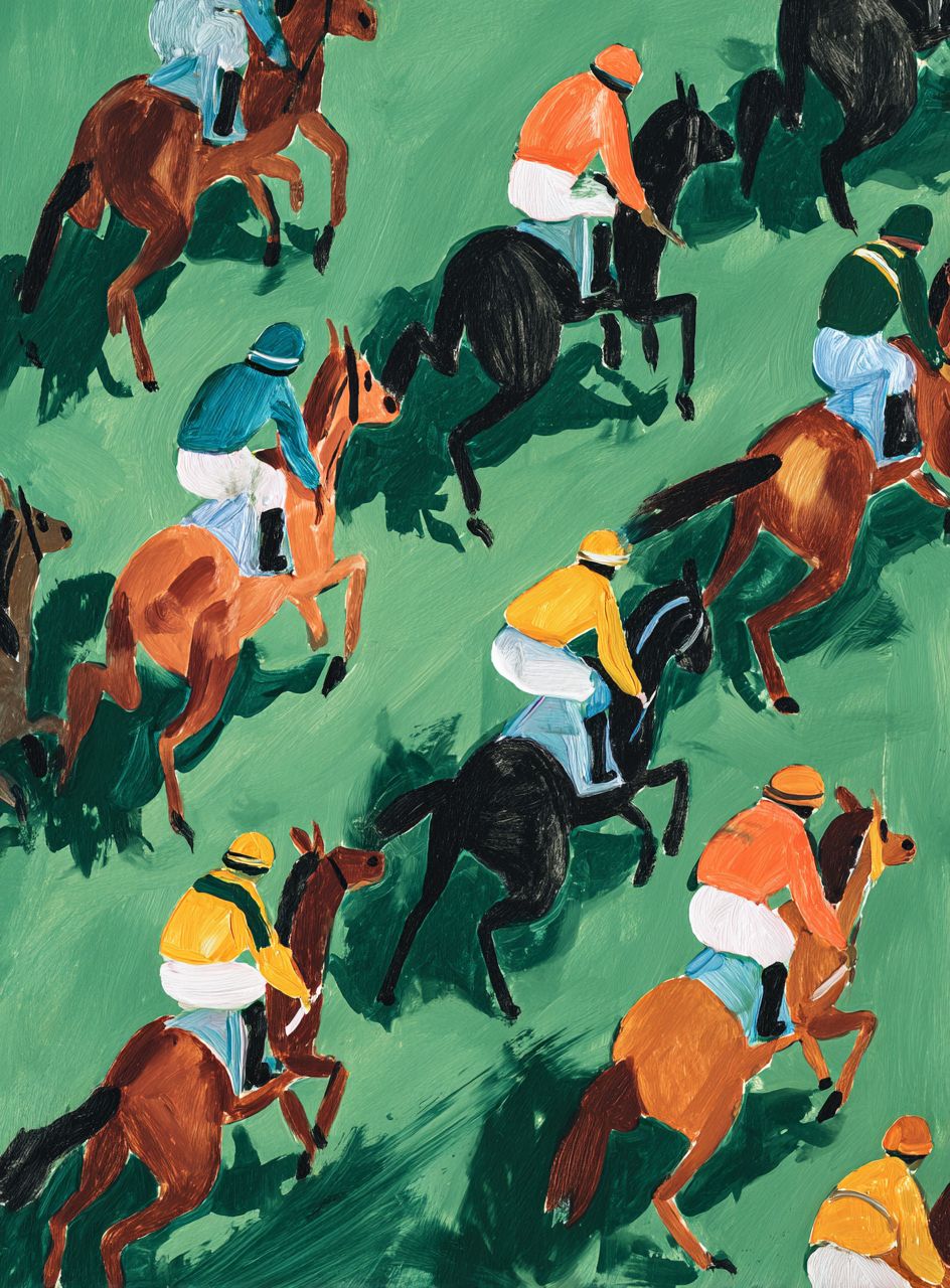一群骑师在马背上比赛,风格融合了亨利·马蒂斯和文森特·梵高,油画,背景为绿色,从高处俯视,具有极简主义特点,扁平插图,几何形状,卡通风格,明亮的色彩,简单的线条,笔触,自然光照,充满活力的氛围。
