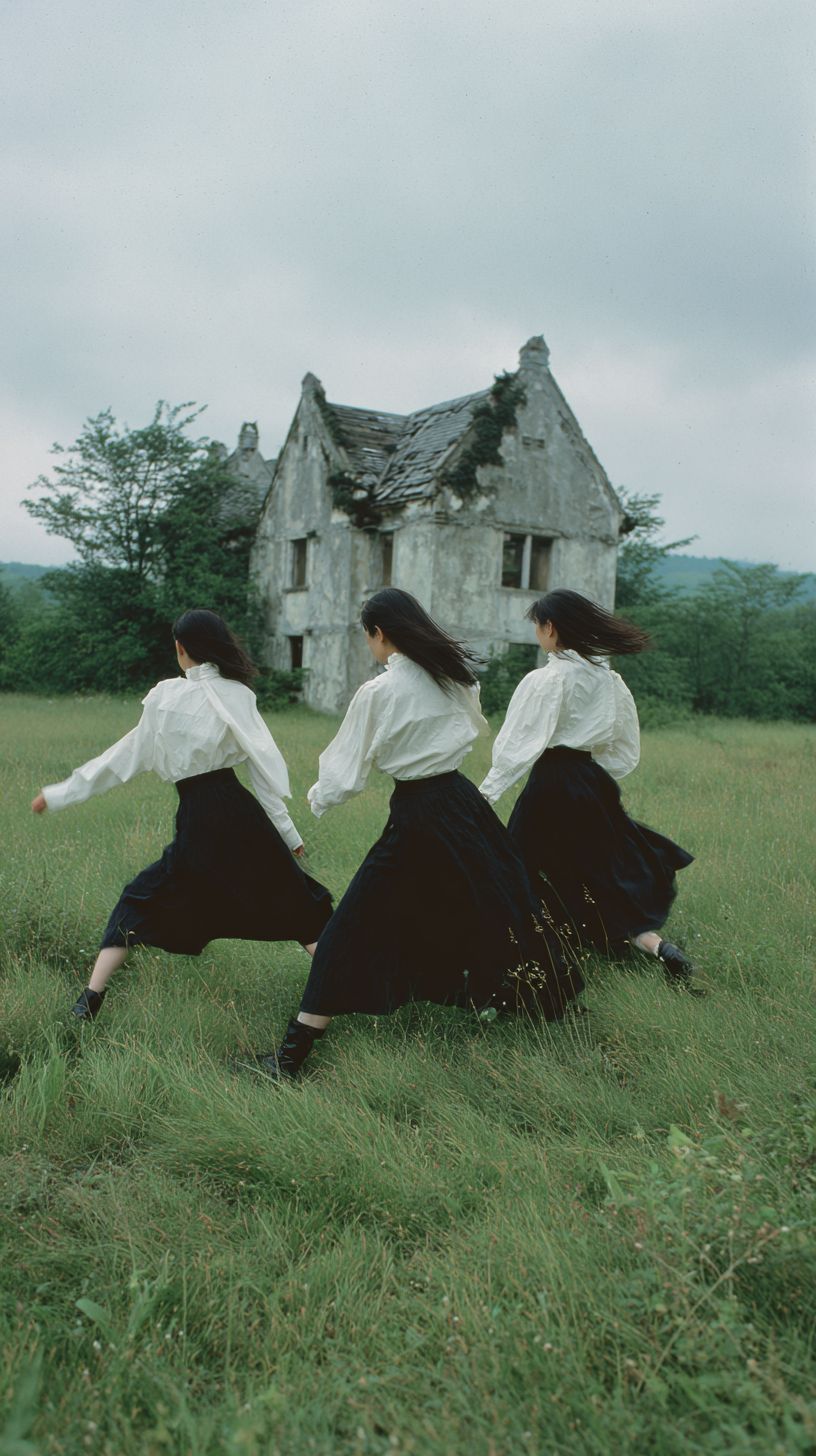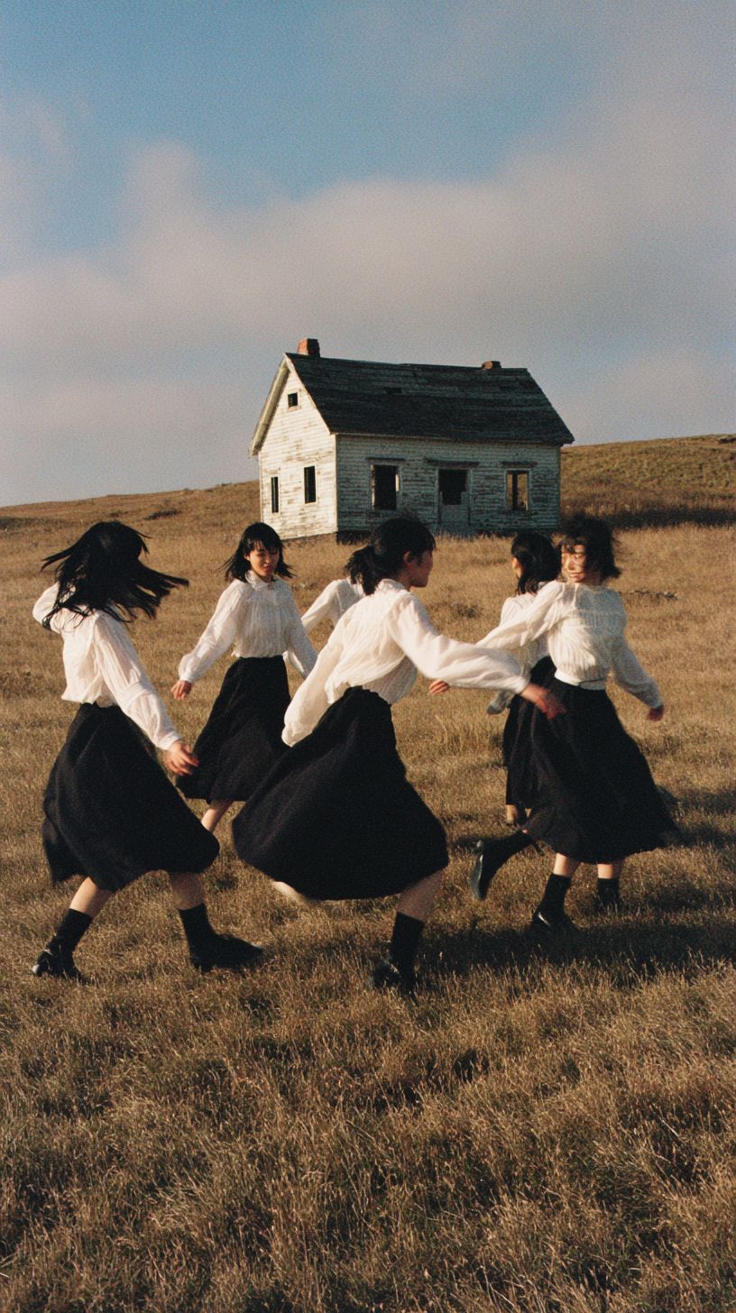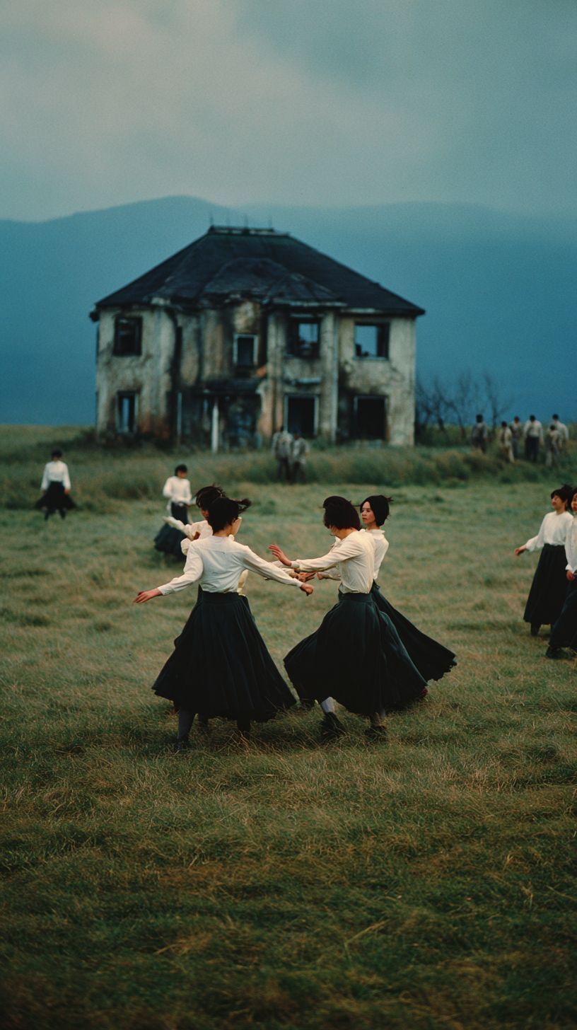 a photograph of young japanese women in white blouses and black skirts dancing on a grassy field, with an abandoned house in the background. the image was captured by tim walker, using kodachrome film and natural lighting. --ar 9:16 --raw --s 50 --v 7.0
