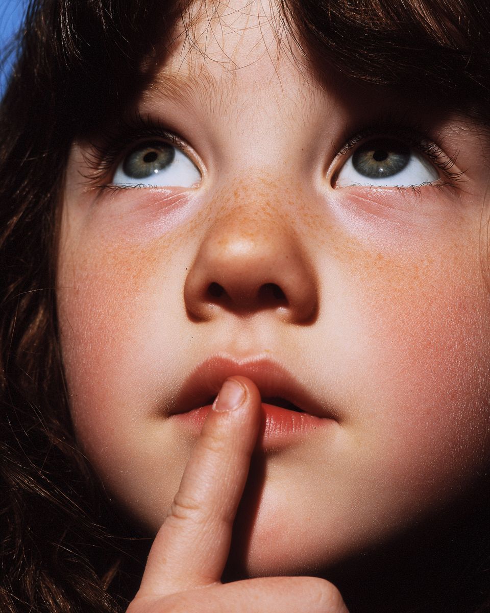 马丁·帕尔风格,特写照片,一名6岁女孩深思地仰望,嘴唇上放着食指,美国学校,2001年《Vogue》儿童时尚编辑风格。