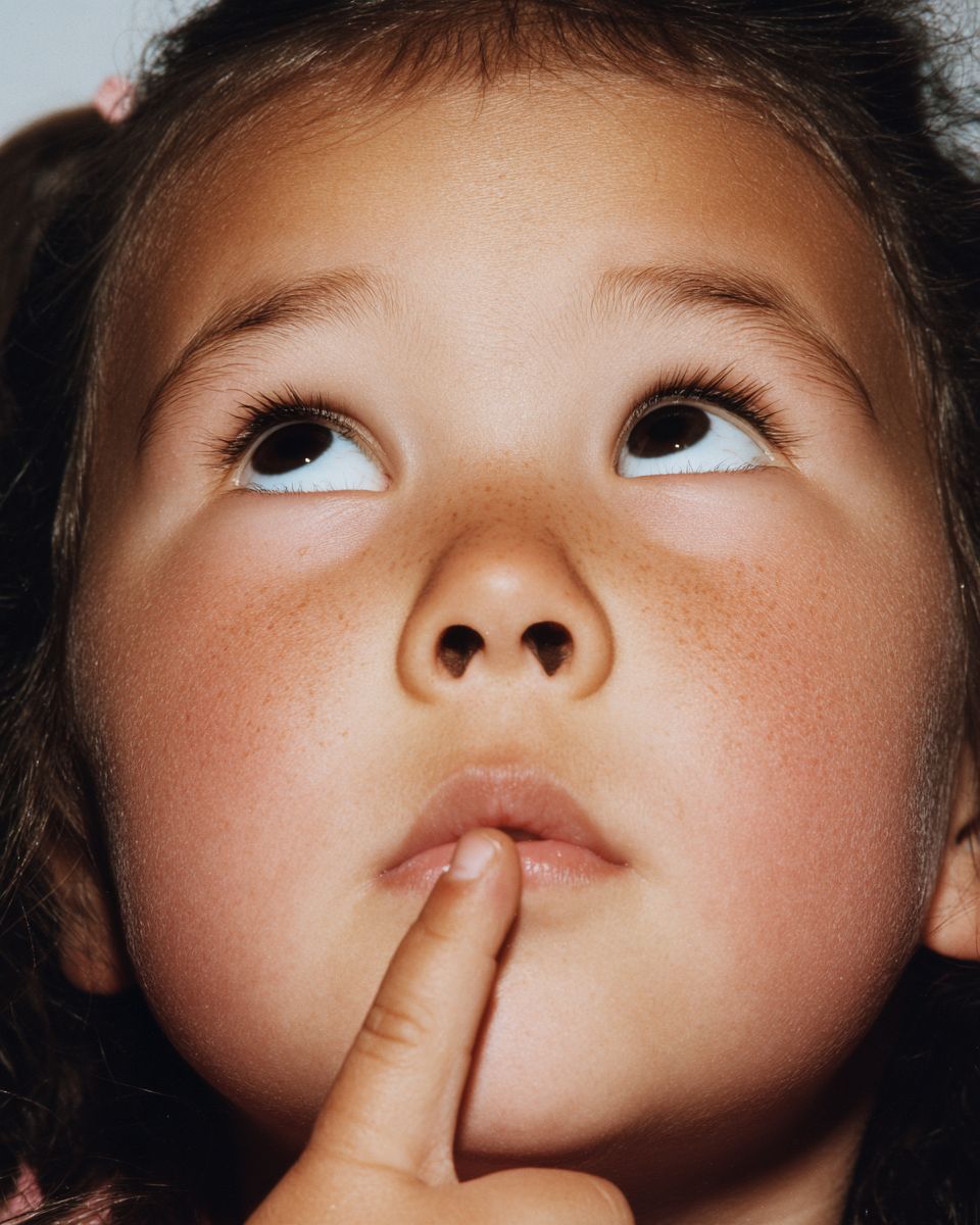 Martin Parr style, Close-up photo of a 6-year-old girl looking up thoughtfully with a finger on her mouth, American school, 2001 Vogue kids editorial style, --ar 4:5 --profile kzilt9y --stylize 50 --v 7.0 --raw