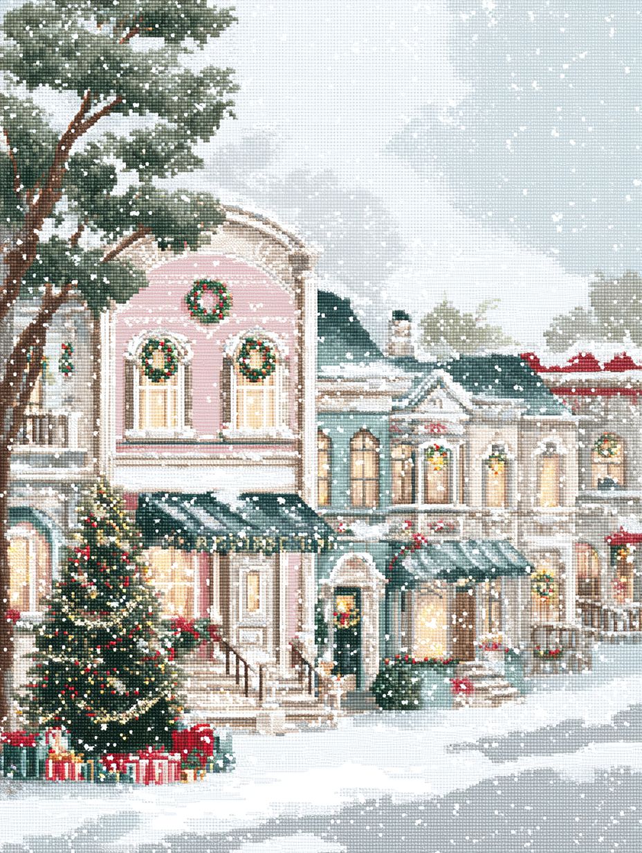 一个如画的圣诞场景展开,雪花轻轻飘落,覆盖了这个宁静的小镇,呈现出柔和的粉色和白色。街道两旁是迷人的房屋,门上挂着花环,营造出温暖和喜悦的氛围。每棵树下都有许多礼物,非常华丽,四周环绕着郁郁葱葱的树木,增添了它的美丽。一颗圣诞树装饰着丝带和灯光,圣诞装饰品装点着每扇窗户。