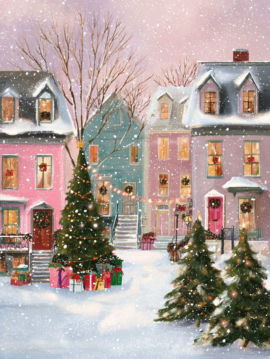 a picturesque christmas scene unfolds as snowflakes gently fall, covering the quaint town in soft pastel hues of pink and white. the street is lined with charming houses adorned with wreaths hanging on their doors, creating an atmosphere filled with warmth and joy. there are many gifts under each tree, which is very beautiful, surrounded by lush green trees that add to its beauty. a christmas tree is decorated with ribbons and lights, and christmas decorations adorn every house window. --ar 3:4 --s 50 --raw