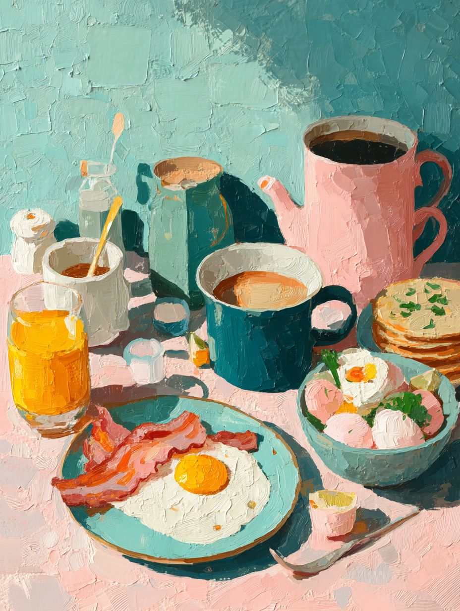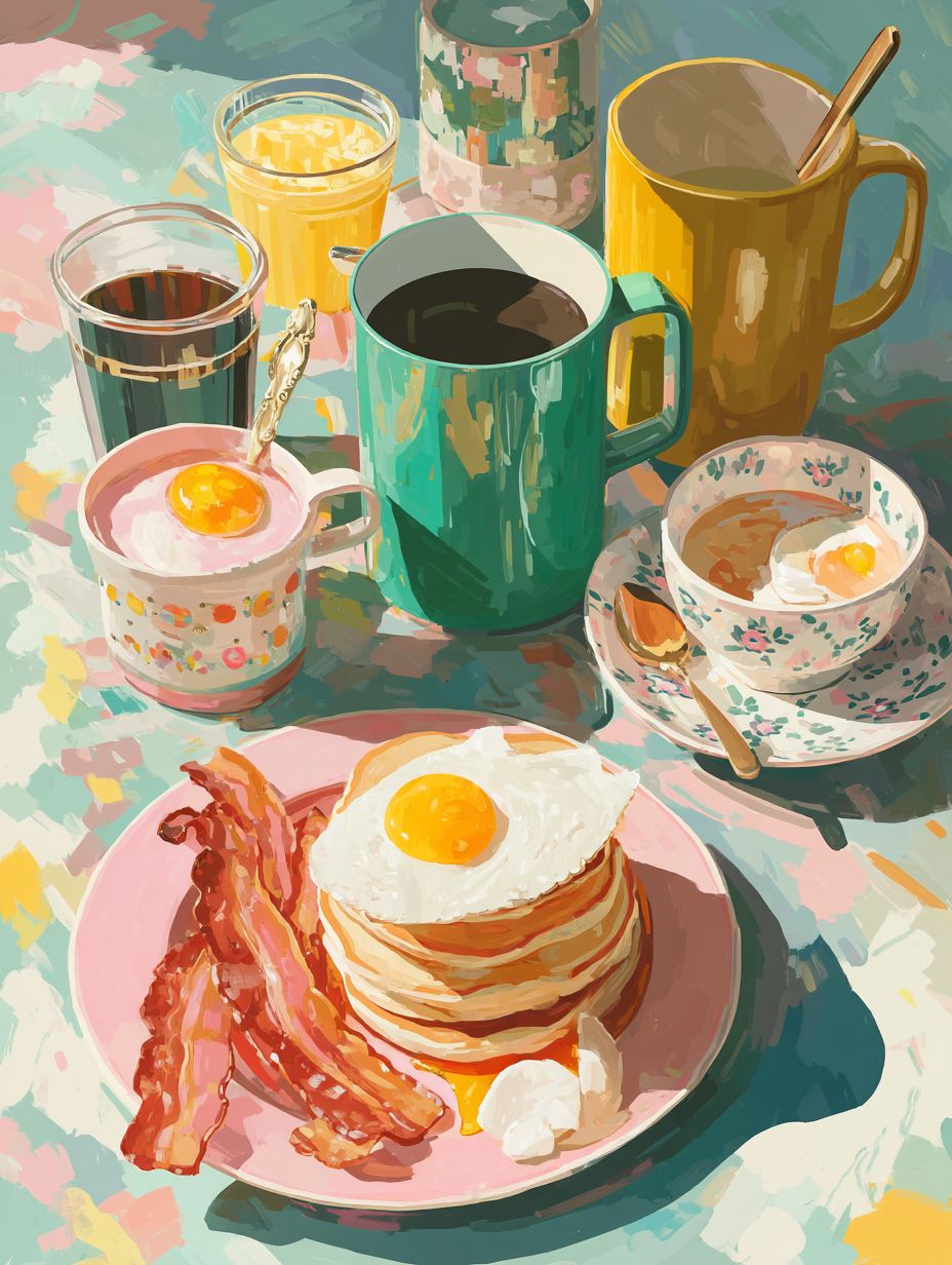 colorful kitchen wall art illustration, modern flat illustration with painterly texture, cozy food still life, vibrant color palette, soft brush strokes, minimal shadows, decorative composition, contemporary folk art style, pastel background, warm and cheerful mood, high detail, classic American breakfast illustration, pancakes, bacon and eggs, coffee mug, modern flat illustration, vibrant pastel colors, soft painterly texture, cozy morning vibe, decorative kitchen wall art --ar 3:4 --quality 2 --raw --stylize 250