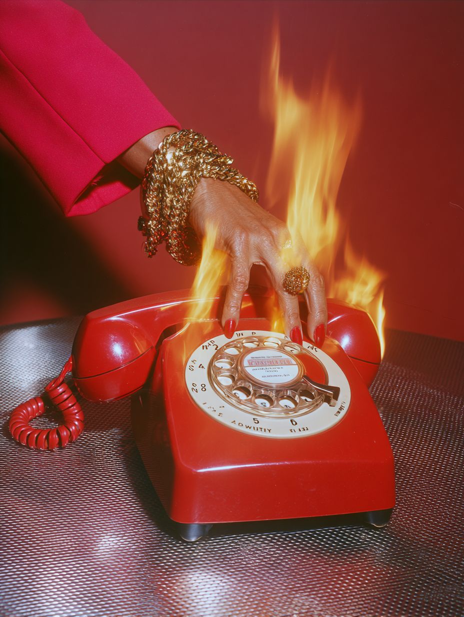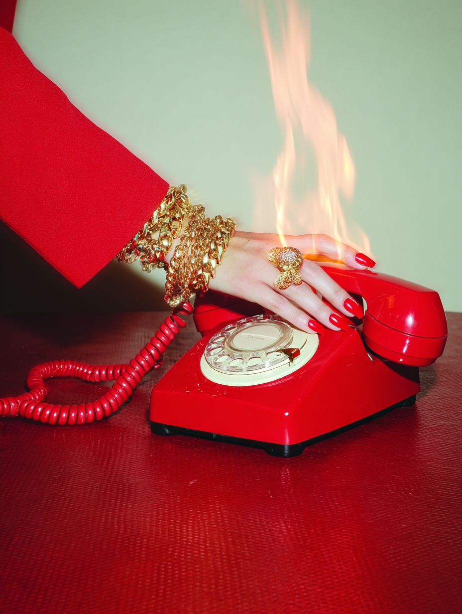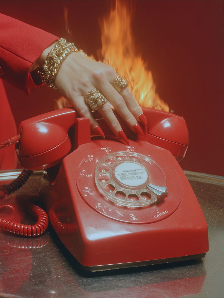 a red rotary phone on a matte red background, the back of the phone is on on fire, a womans arm reaches in wearing a red blazer, you can see her wrist and hand as she reaches for the phone and then picks it up. She has red long nails and gold chunk jewelry like the 80s, the phone is on a metal table --chaos 5 --ar 3:4 --raw --profile scatxtw --stylize 50