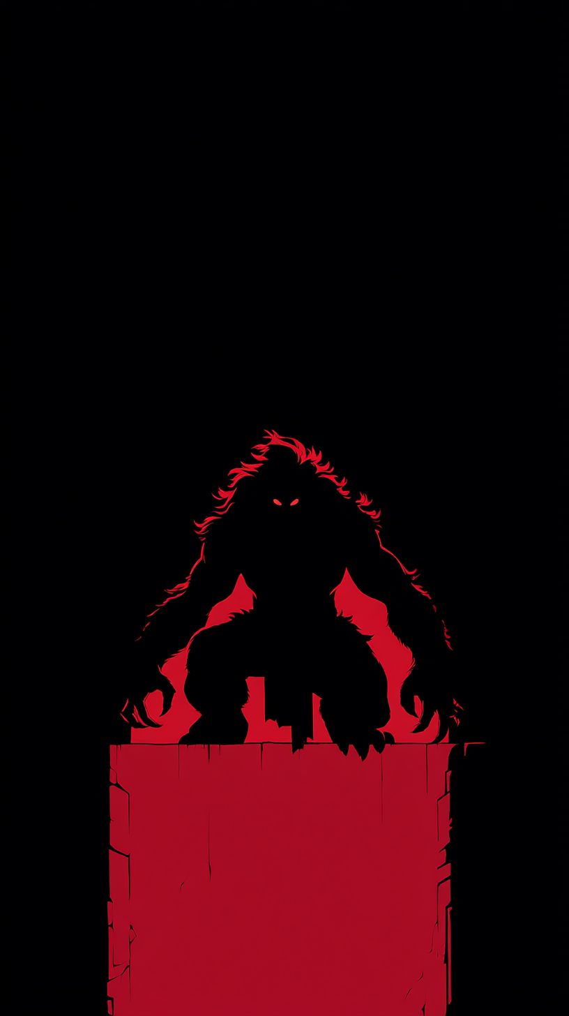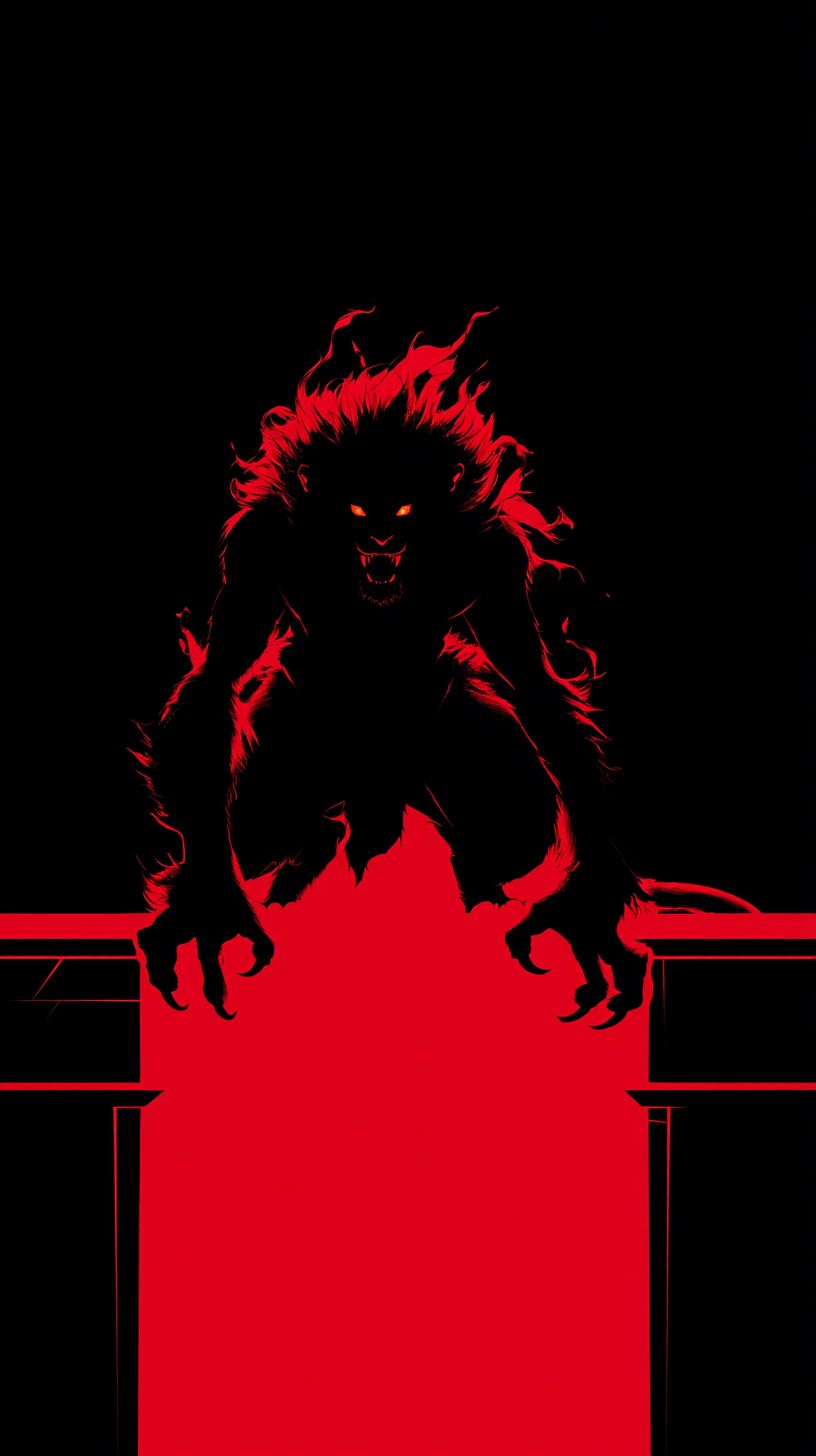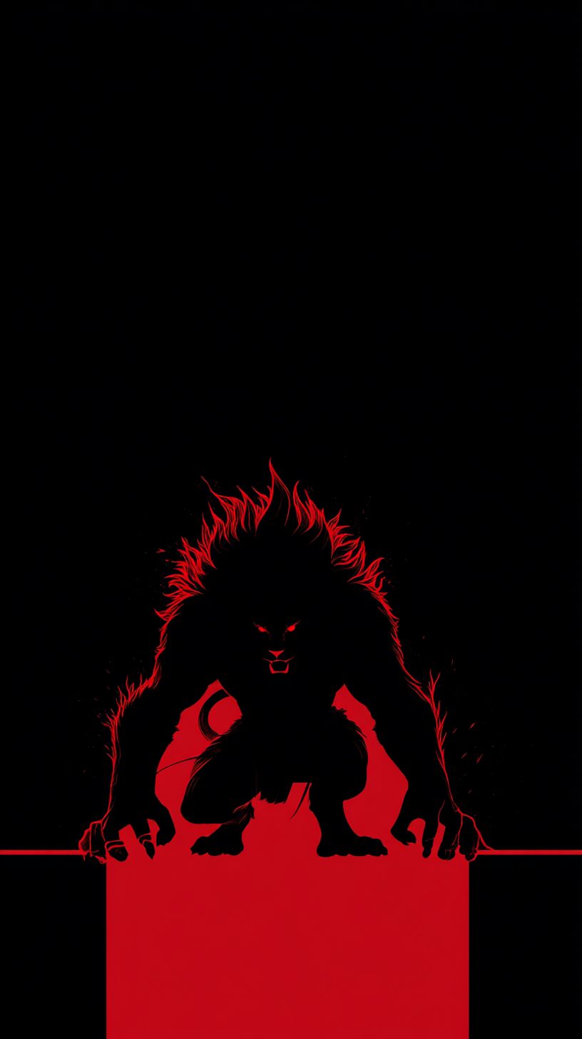 一幅可怕的双色AMOLED壁纸,描绘了在神圣门槛时刻的那罗狮身人身,采用极简的哑光轮廓 × 表现主义黑色作品,仅使用纯黑与深朱红色。那罗狮身人身处于正中央,横跨内外部之间的无形边界,雄伟的狮子形态低伏,准备爆发,双膝弯曲,躯干向前倾,爪子伸出,紧 gripping 住门槛石的边缘。他的鬃毛犹如燃烧的火焰向外爆发,打破周围的黑暗。面部仅通过轮廓部分可见——张开的下颚通过负空间暗示,尖牙被暗示而非详细描述——而眼睛如同两点炽热的朱红色,刺眼且无法逃避。朱红色的能量以暴烈的强度勾勒出他的全身,尤其是在爪子、肩膀和鬃毛周围,仿佛神圣的愤怒正在突破束缚。建筑门槛仅通过两面垂直黑色平面和他脚下的一条单一水平朱红线微微暗示,象征着他即将违反的宇宙法则。没有背景,没有天空,没有地面——只有虚空与审判。构图为竖向,令人窒息,完美平衡,为AMOLED显示屏优化,其中黑色消失,朱红色刺眼,捕捉那罗狮身人身在瞬间即将 annihilation 的时刻,时间本身都不敢流动。