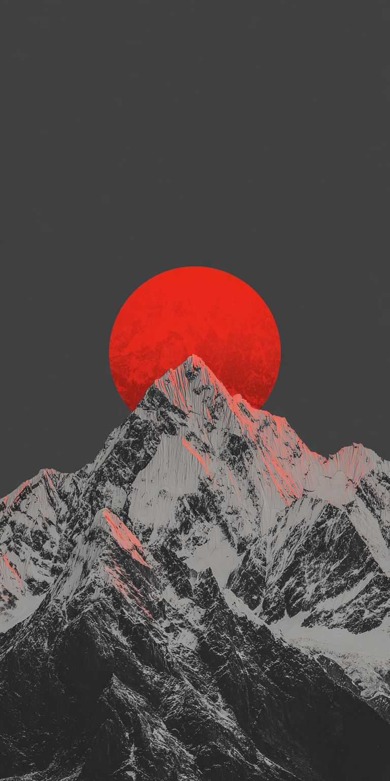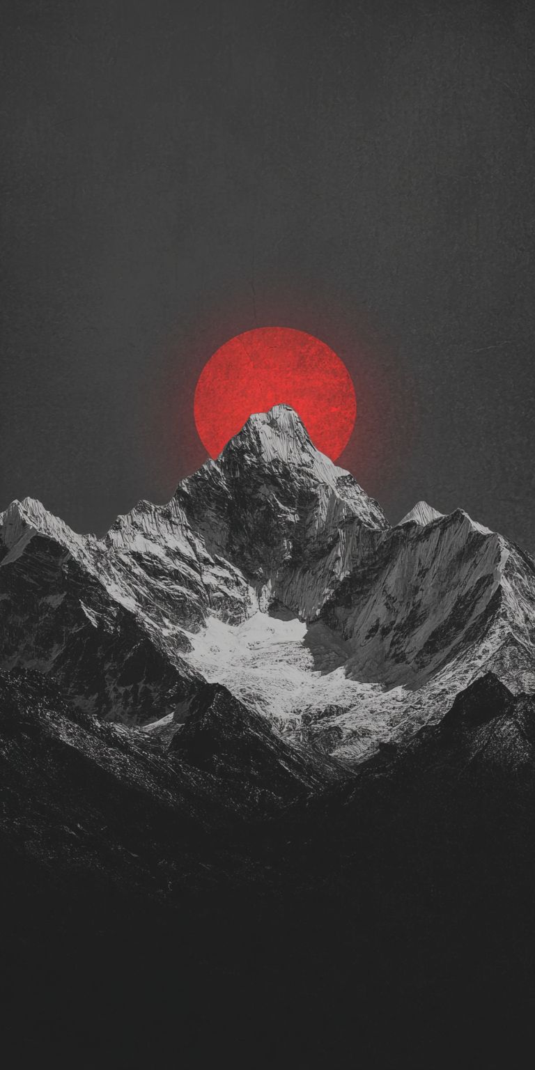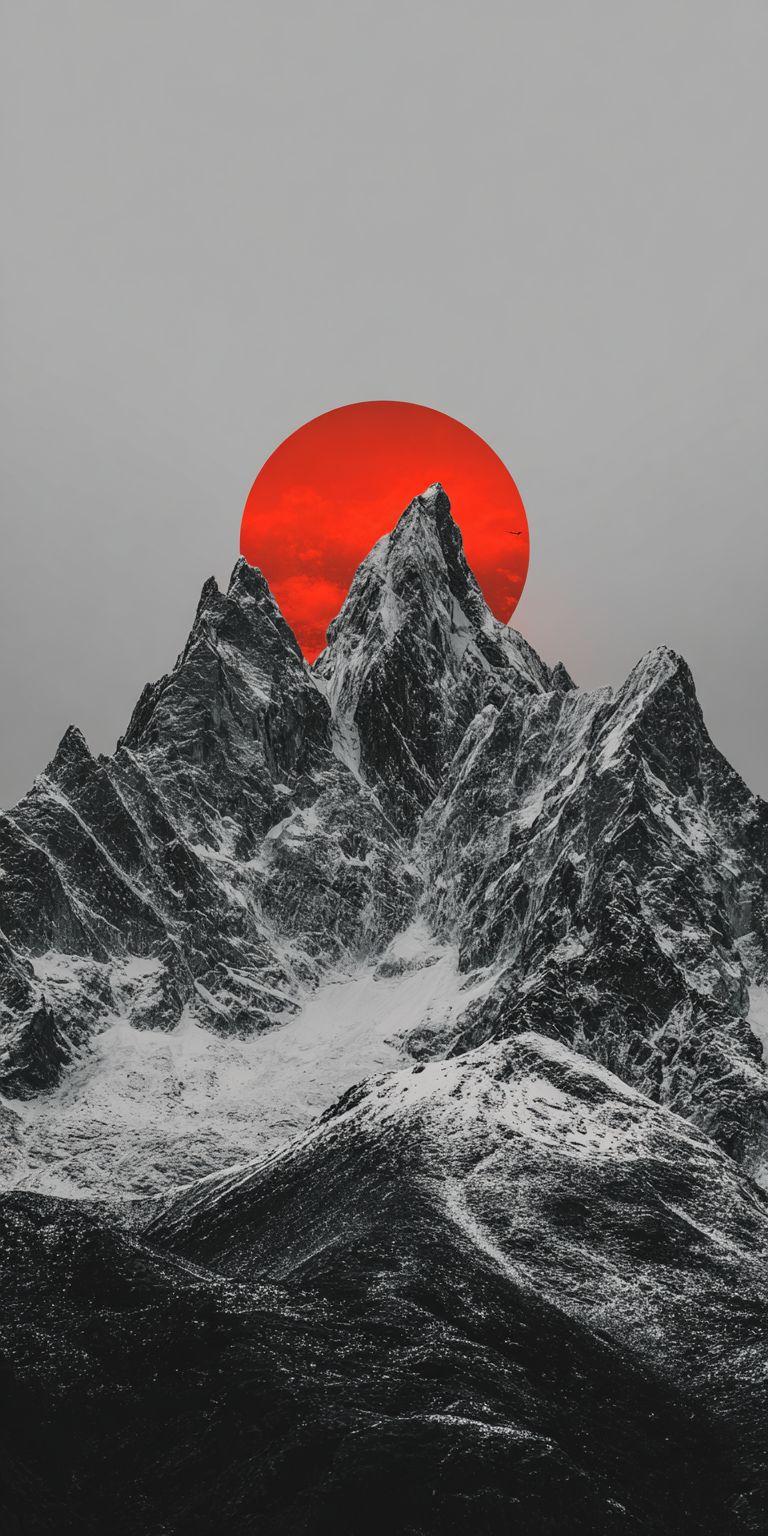 cinematic minimalist mountain landscape, jagged snow-covered peaks in dark grayscale tones, massive glowing red sun rising behind the central mountain, dramatic contrast between crimson red and deep charcoal sky, moody and atmospheric, painterly digital art style, sharp silhouettes, high detail mountain textures, epic scale, calm and powerful mood, premium wallpaper aesthetic, no text, no people large empty sky area at top for iOS lockscreen clock, clean composition, subject placed in lower frame --ar 1:2 --s 50 --raw