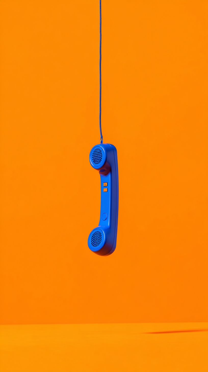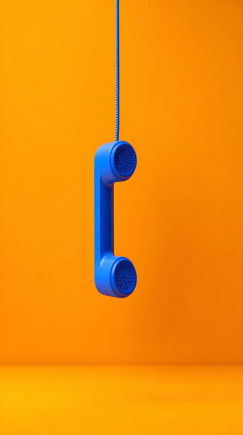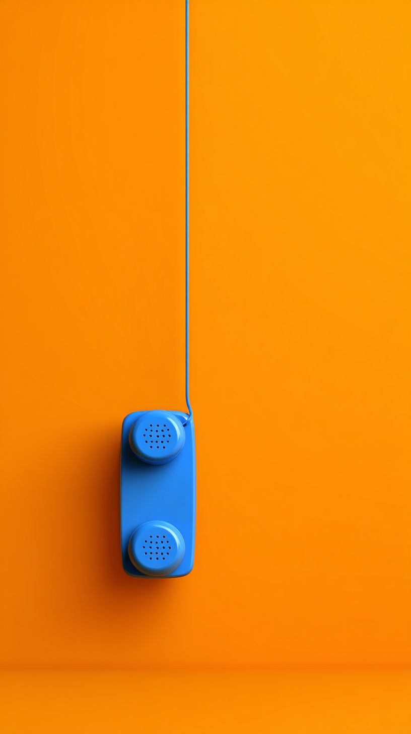 photo of a blue phone hanging on an orange background, symbolizing communication and conversation. solid color background, simple and minimalist, 3d rendering, stock photo. --ar 9:16 --s 50 --raw