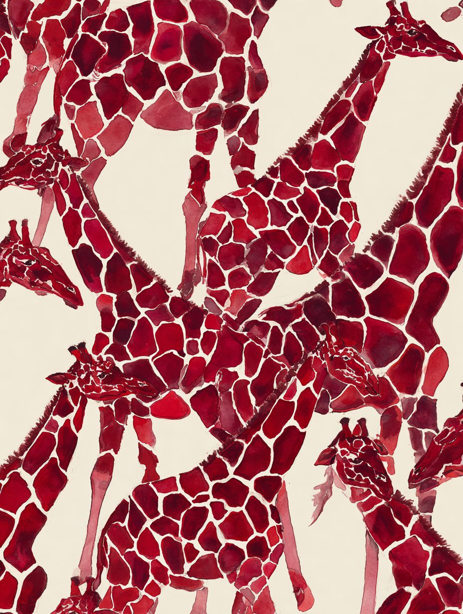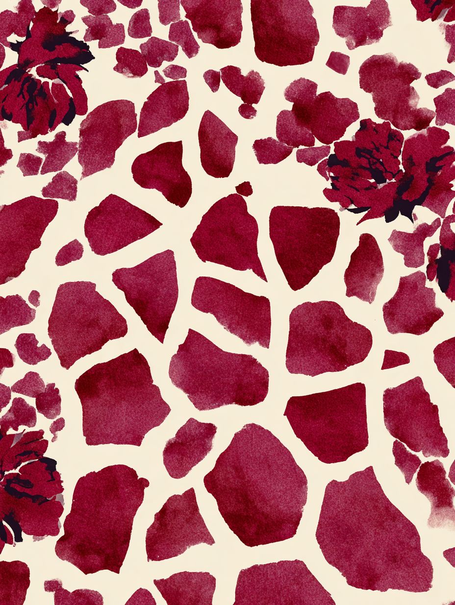 无缝纺织印花,以长颈鹿为灵感的图案,带有大不规则多边形块,边缘圆润有机,紧密排列,最小间隙,色彩鲜明对比设计,水彩风格,丰富深邃的猩红色长颈鹿斑点配在淡象牙色背景上,图形而奢华的外观,超大的图案,高档动物印花重新诠释,密度非常低,花卉图案广泛分布,有大量留白,图案之间的空气感间距,图案相对彼此更远,以揭示更多底色,布局中背景可见部分多于图案,湿碰湿的水彩风格