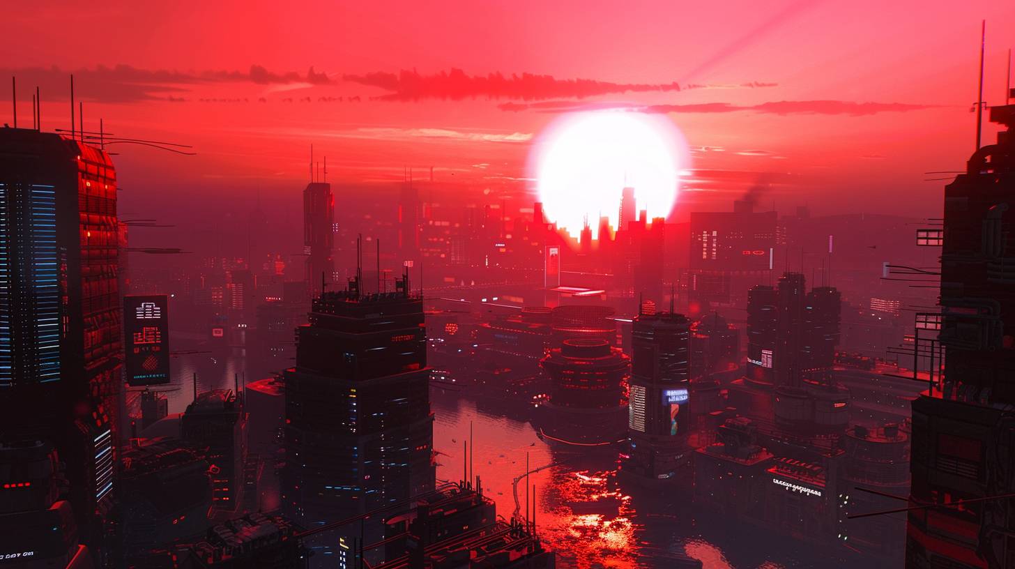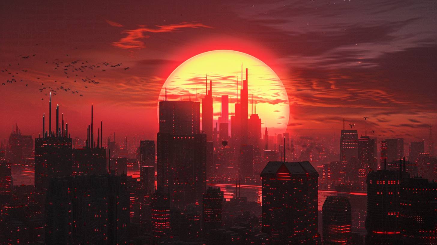 A fiery, pulsating sun dips below the horizon, casting a vibrant crimson glow over a futuristic cityscape, its sleek, metallic structures reflecting the fading light --ar 16:9 --style raw --v 6.0