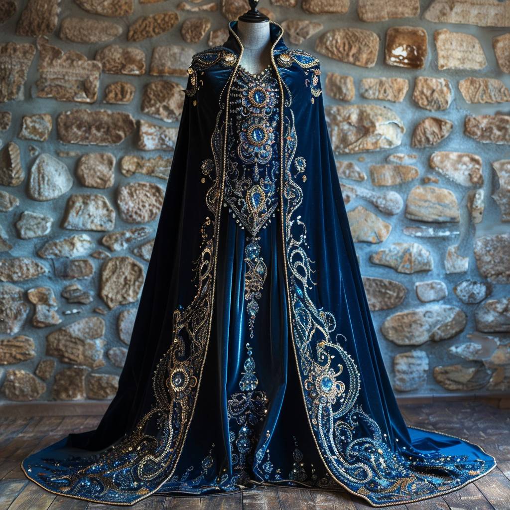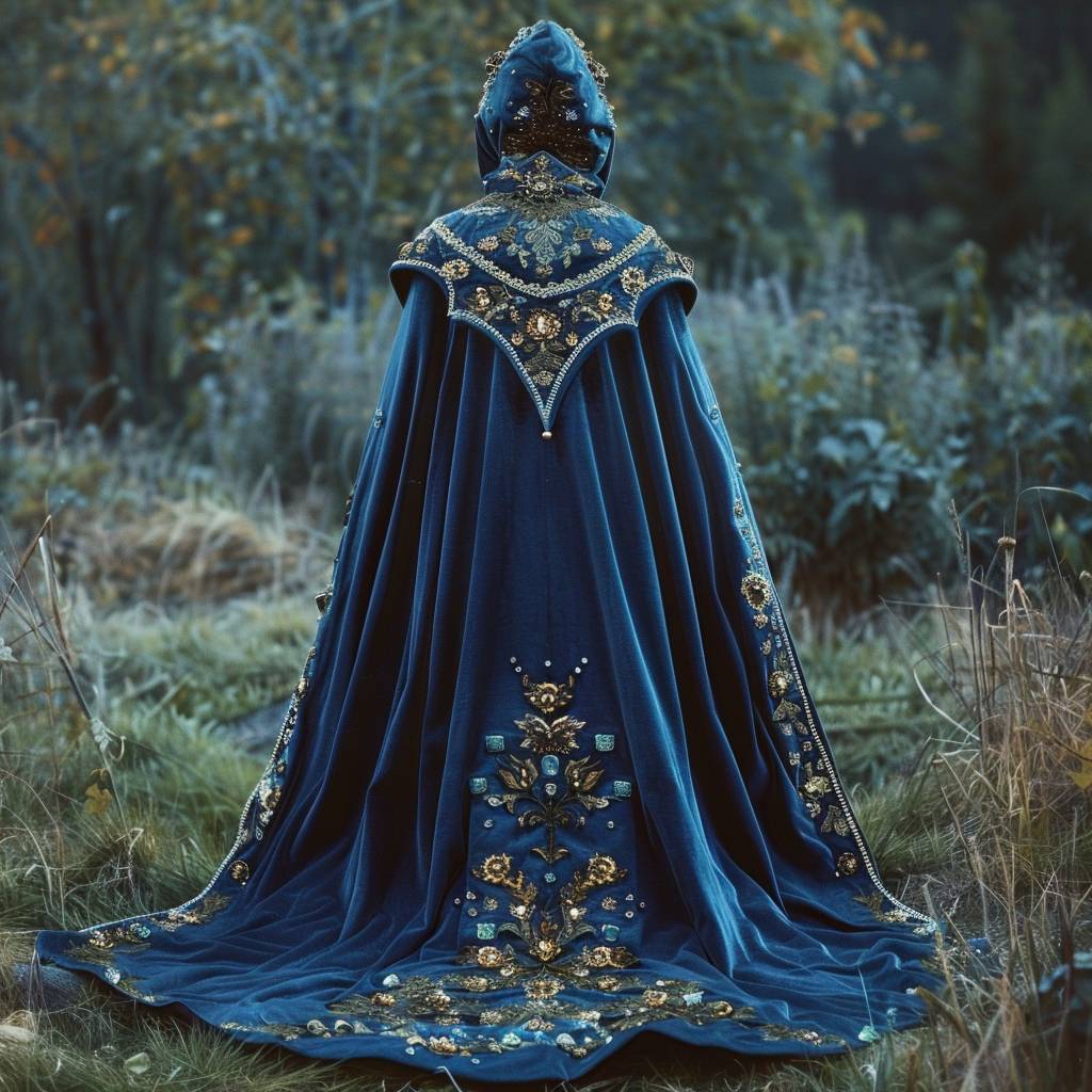 一件由蓝色天鹅绒制成的时尚中世纪斗篷,镶嵌宝石,细致华丽,刺绣迷人。