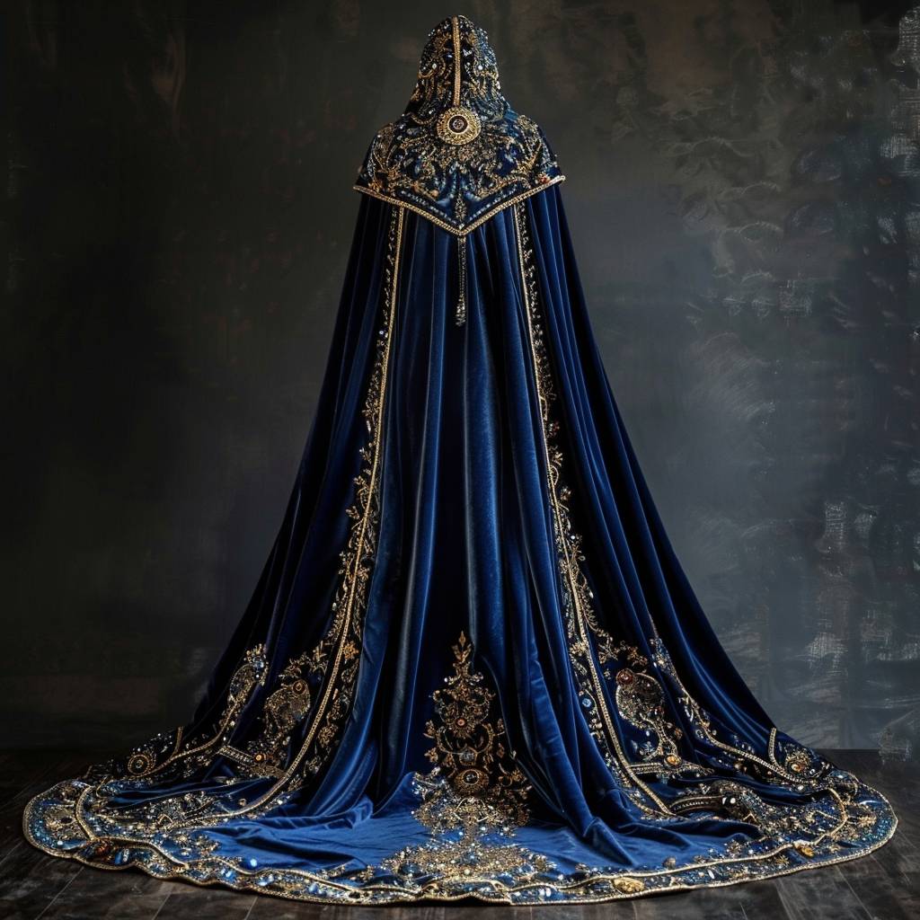 a fashion medieval cloak made of blue velvet, bejeweled, rich detailing, embroidery, magical --v 6.0