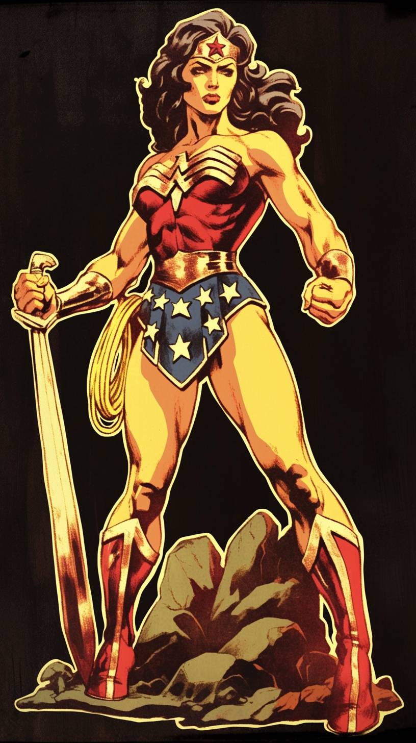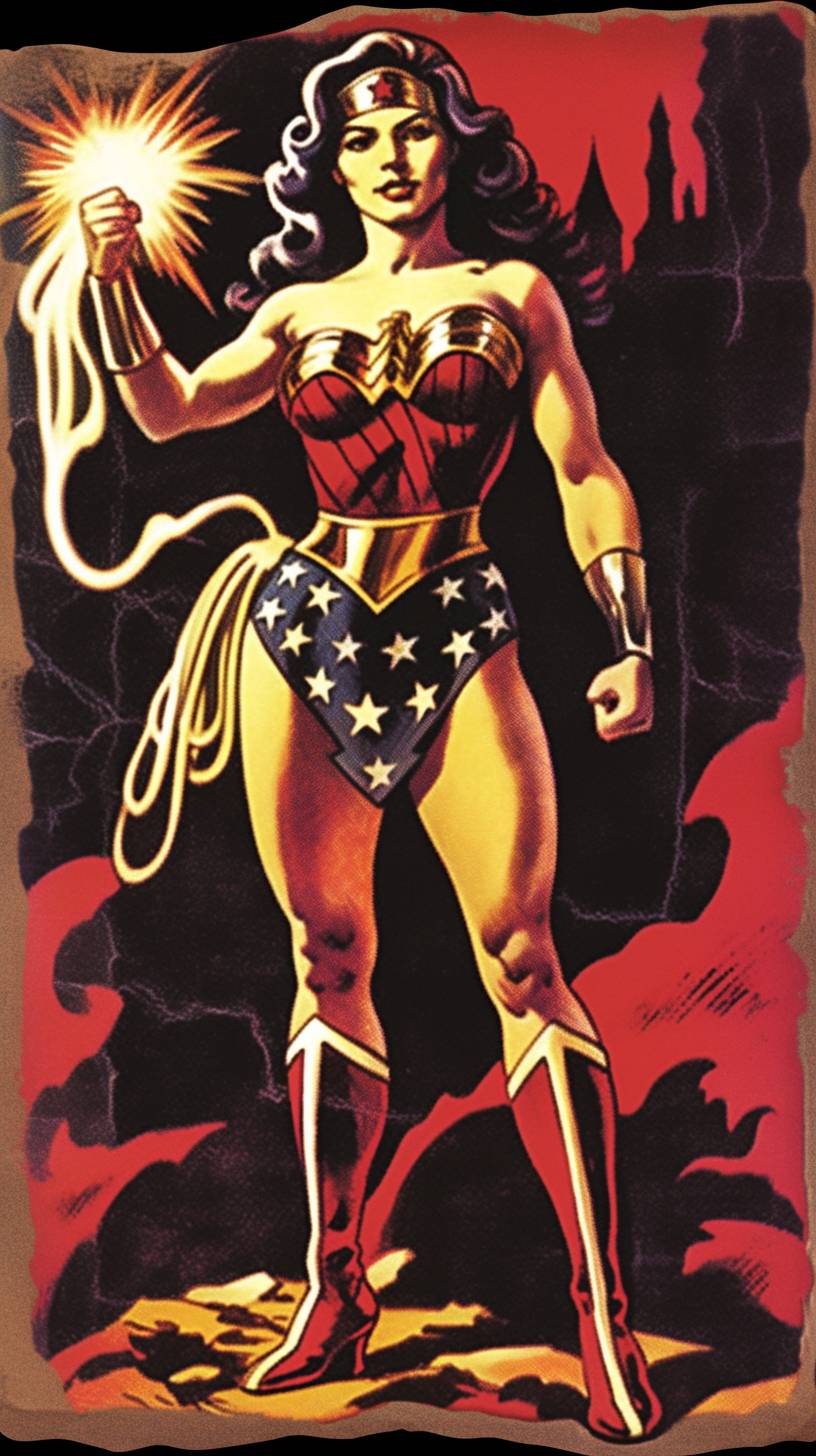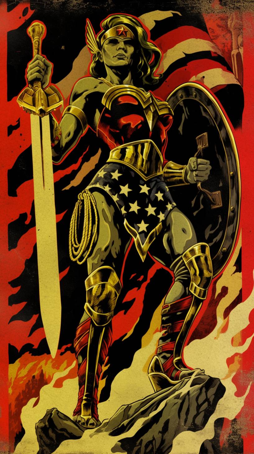 神奇女侠,弗兰克·弗拉泽塔风格,漫威漫画,令人心醉的幻觉,女性文化,完美的线条工作,云雾般的存在,漫画核心,狂野而大胆,使用70毫米镜头拍摄,深金色与红色,详细的服装,明暗对比的精妙掌控,恐怖故事,获奖作品