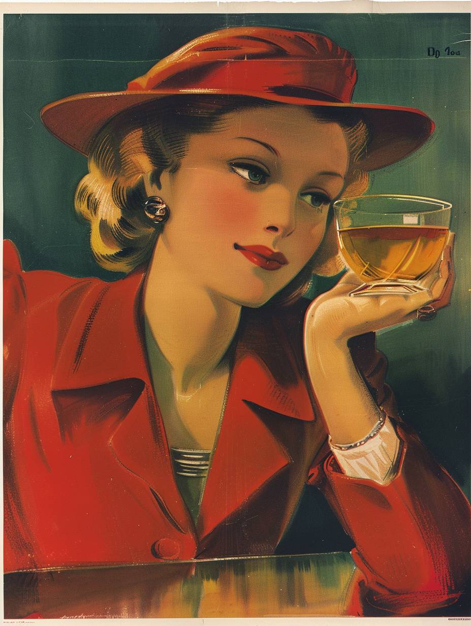 艺术海报复古,位于Monopol-Andermatt的酒吧,简单的女性形象与一杯酒混合,Marcello Dudovich的艺术风格