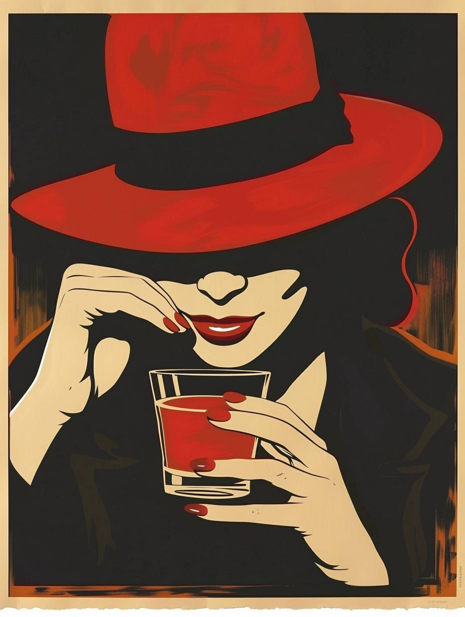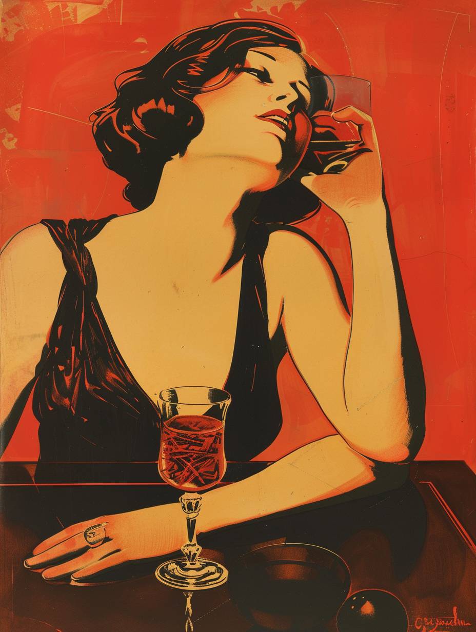 复古艺术海报,描绘了在Monopol-Andermatt酒吧的简单女性形象与一杯酒的结合,采用Marcello Dudovich的艺术风格。