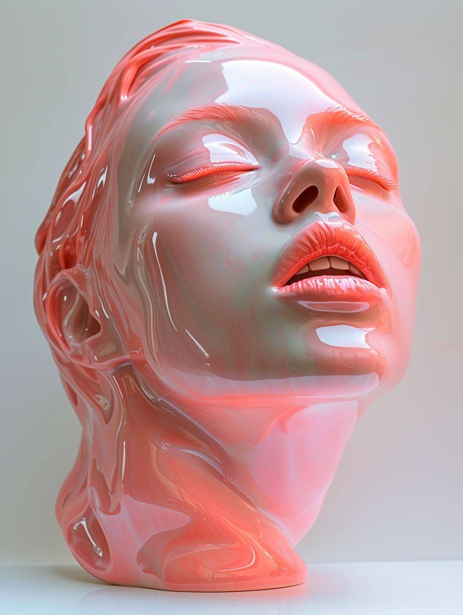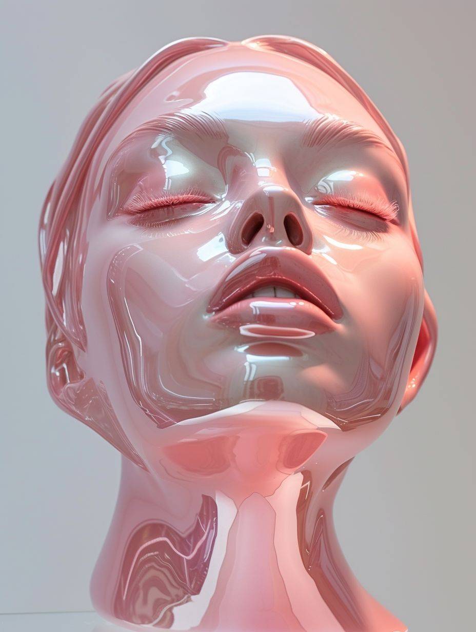 女性仿生陶瓷光泽粉色面雕像,突出于背景,正面视角,明亮照明,超逼真,现代极简主义,未来派