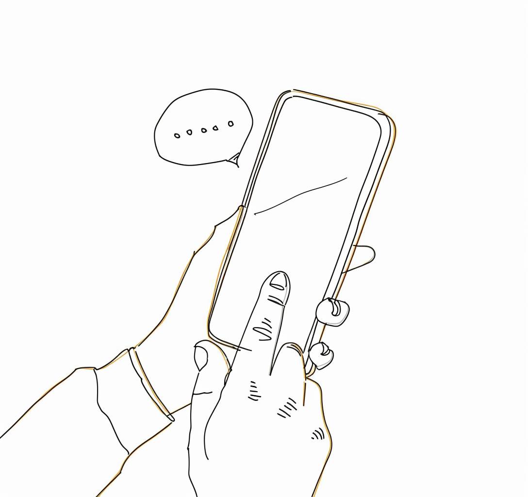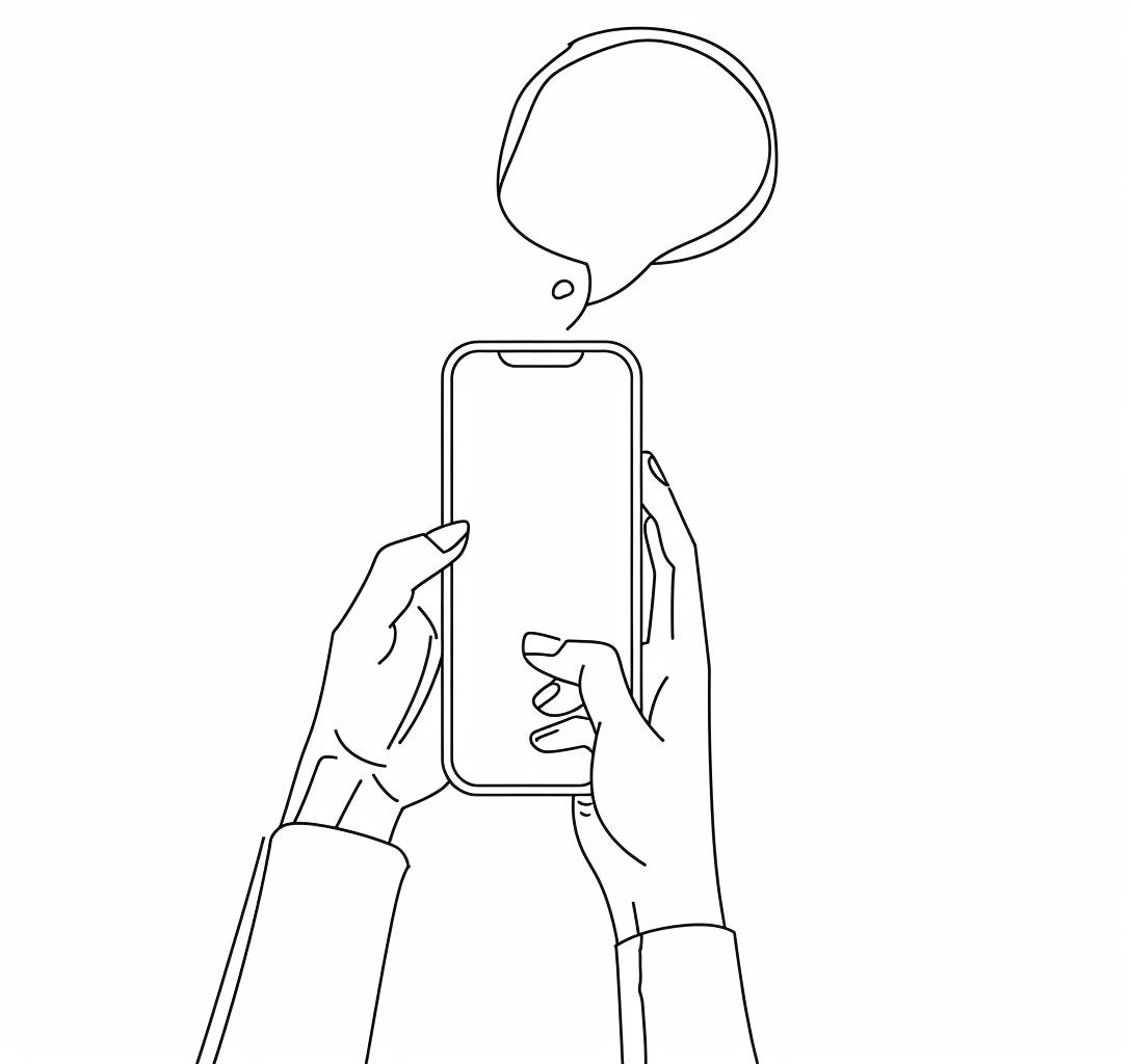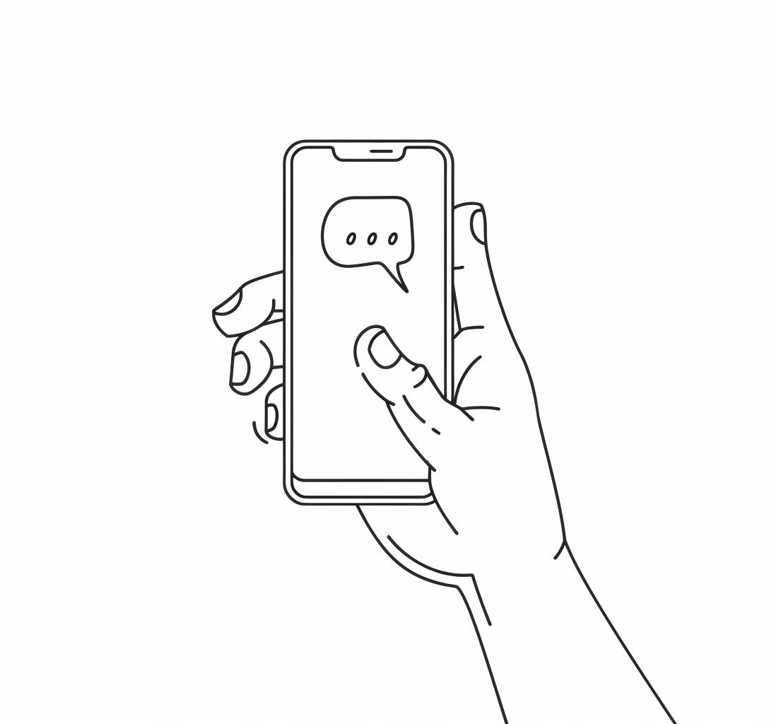 一幅线条画风格的简单画作,画中是一只手握着智能手机,屏幕上方有一个对话气泡,背景为白色,风格呈现为匿名艺术家。