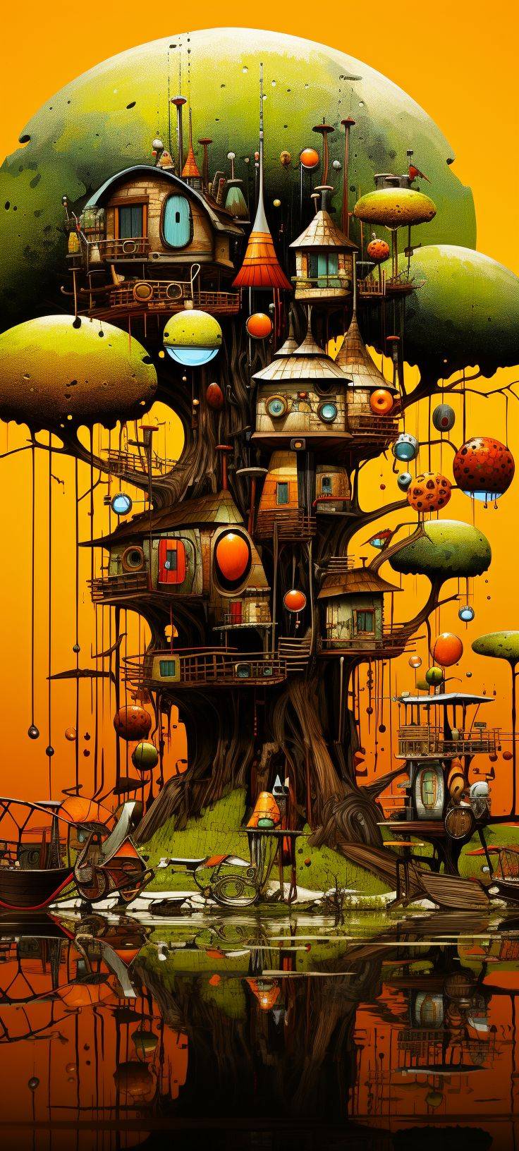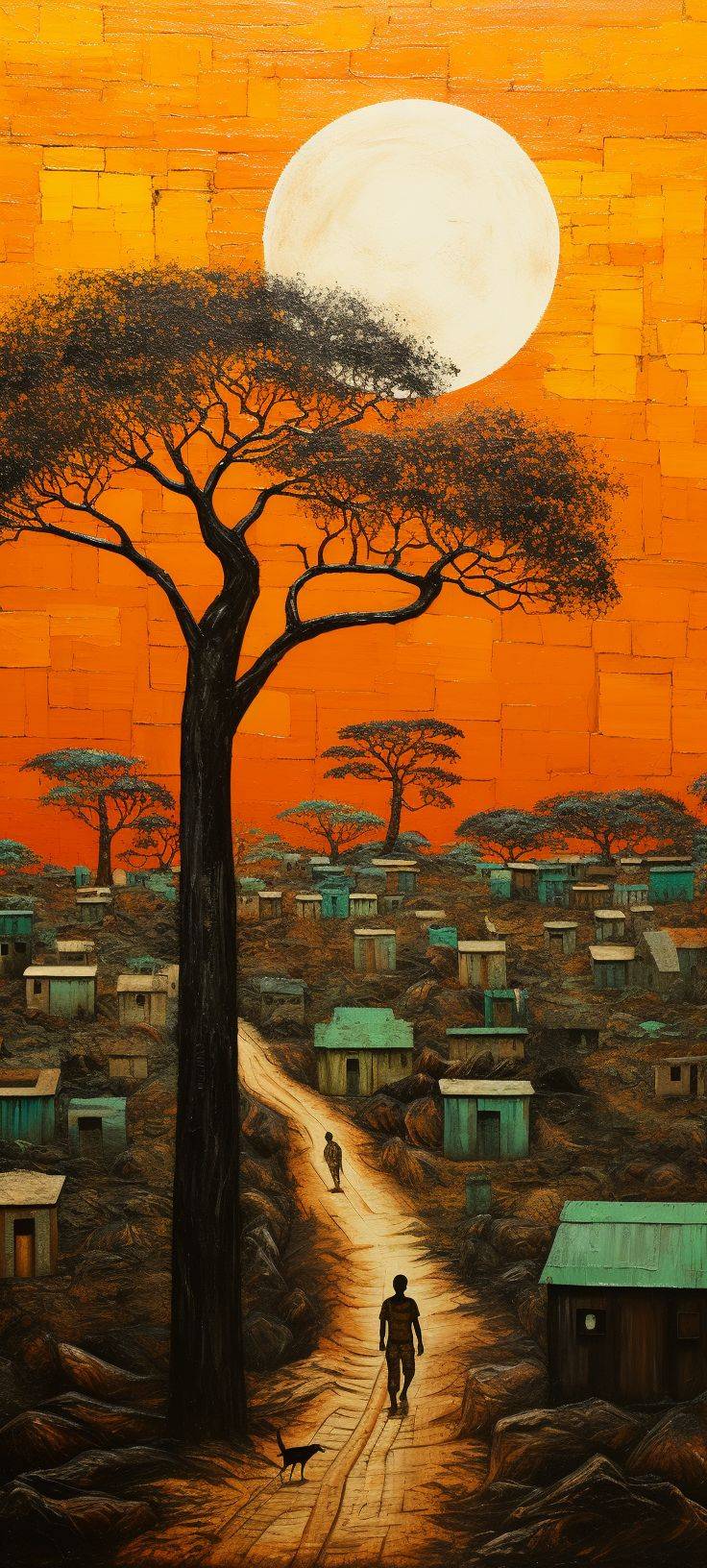 Malagasy art of SUBJECT , art gallery worthy, in the style of Nirina Rakotomalala, majestic baobab tree, rich saturated hues like green and brown, surreal --style raw --chaos 30 --ar 9:20 --stylize 260 --weird 26