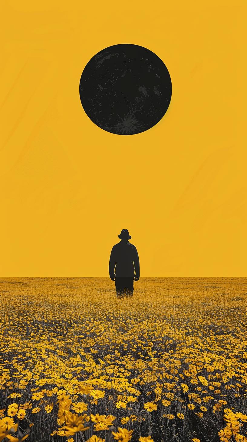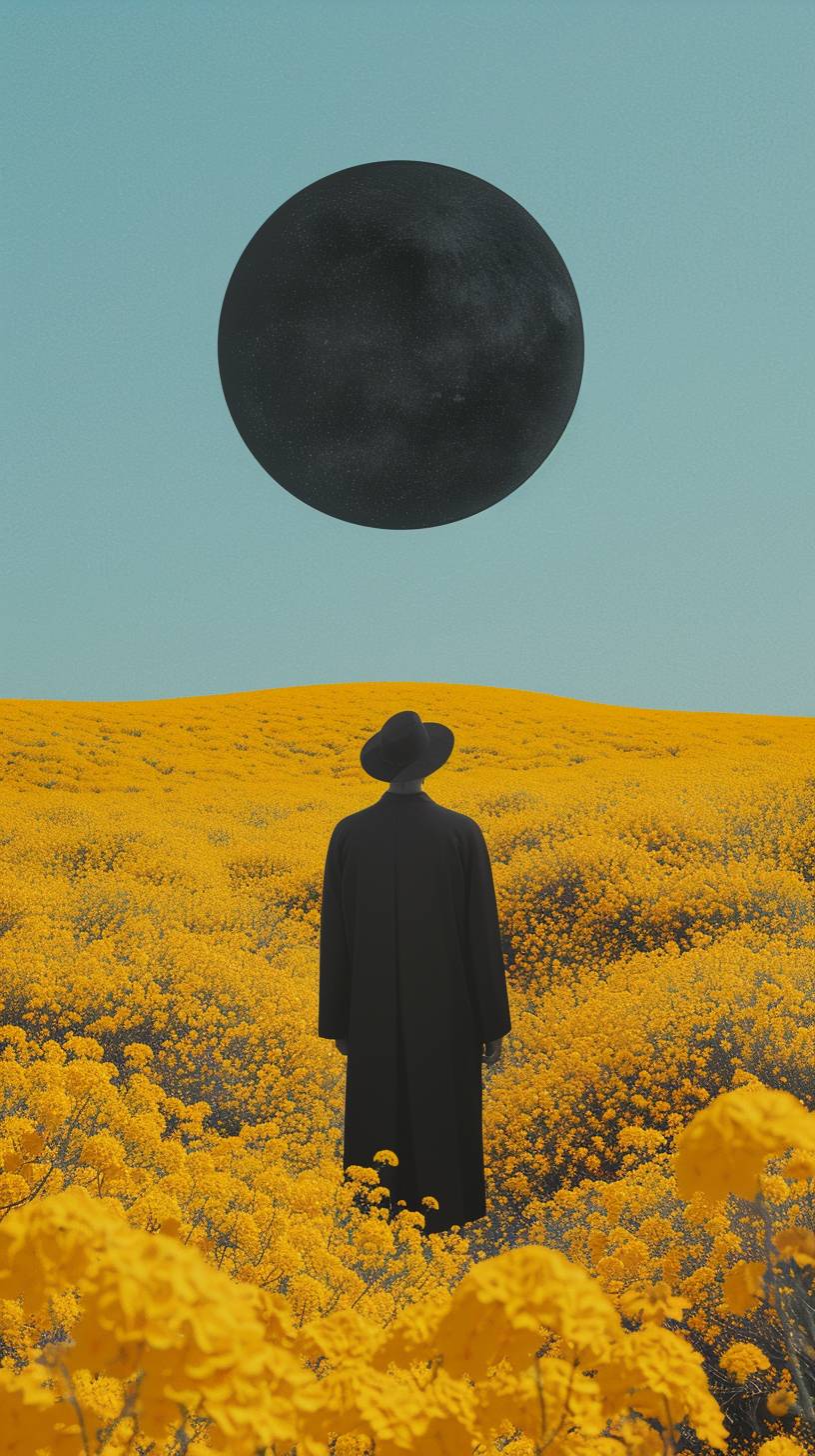 一幅极简主义的超现实数字艺术作品,描绘了一个孤独的人物站在一片覆盖着黄色花朵的广阔田野中。这个人身穿黑色服装和帽子,背对着镜头,与生机勃勃的黄色景观形成鲜明对比。在他们的头上漂浮着一个大黑圆,给场景增添了深度和对称感。这幅作品在自然之美中唤起了孤独的感觉,呈现出超现实主义艺术家的风格。