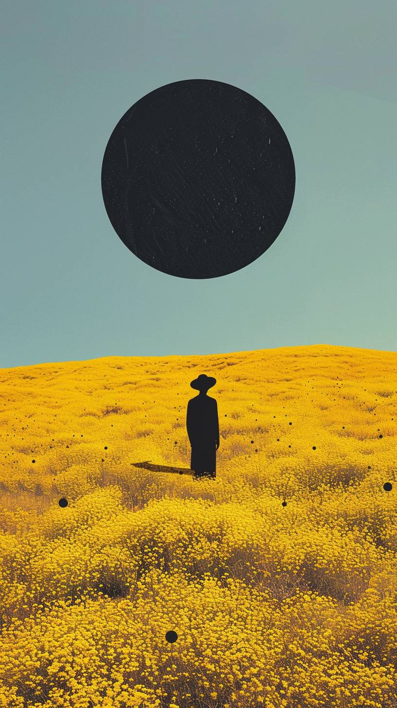 A minimalistic surreal digital art piece depicting an isolated figure standing in the middle of a vast field covered with yellow flowers The person is wearing black and hat, their back to camera creating a striking contrast against the vibrant yellow landscape. Above them floats a large black circle, adding depth and symmetry to the scene This composition evokes a sense of solitude amidst nature's beauty, in the style of a surrealist artist --ar 9:16 --v 6.0
