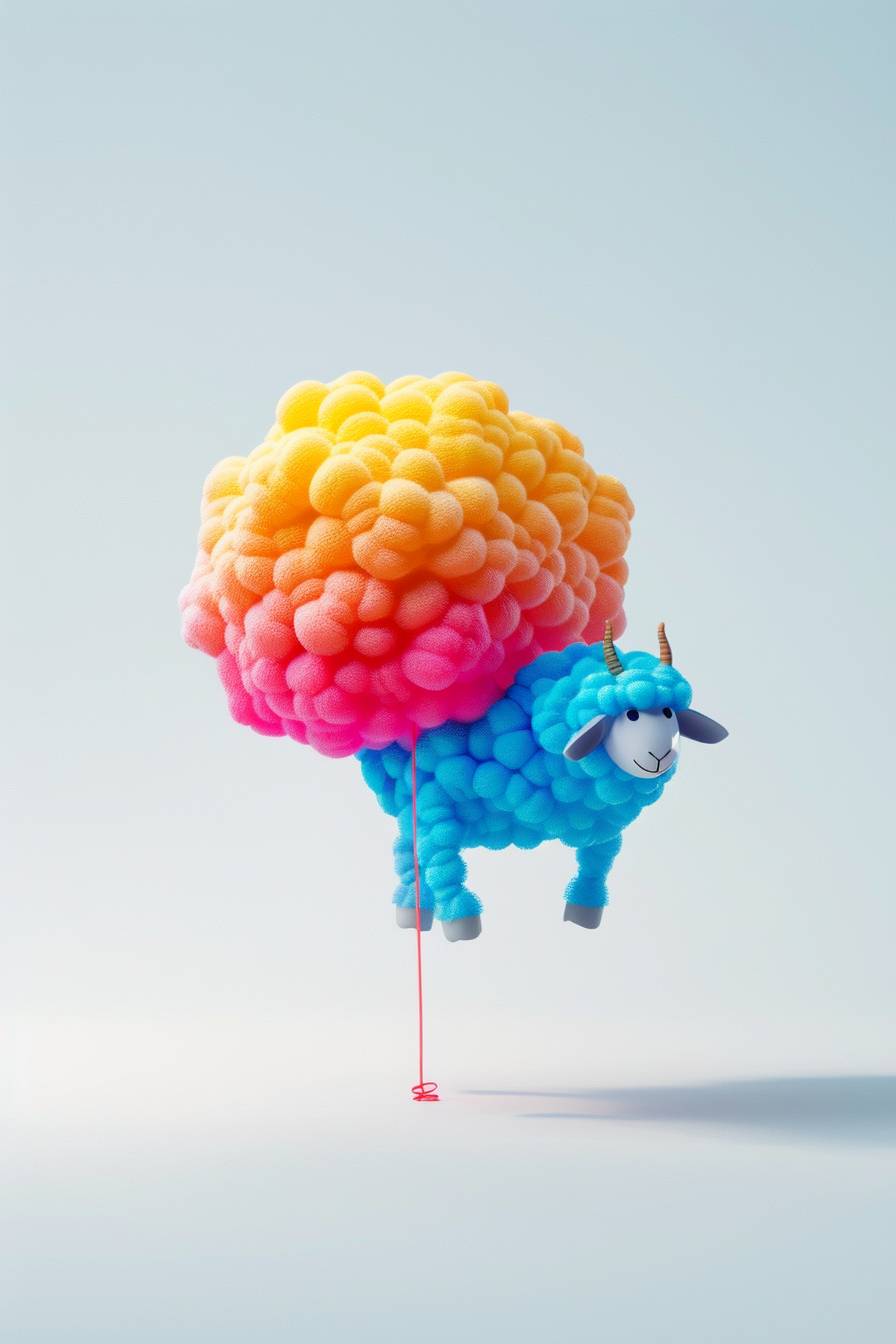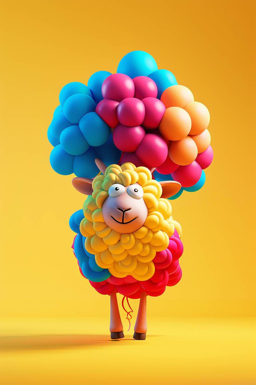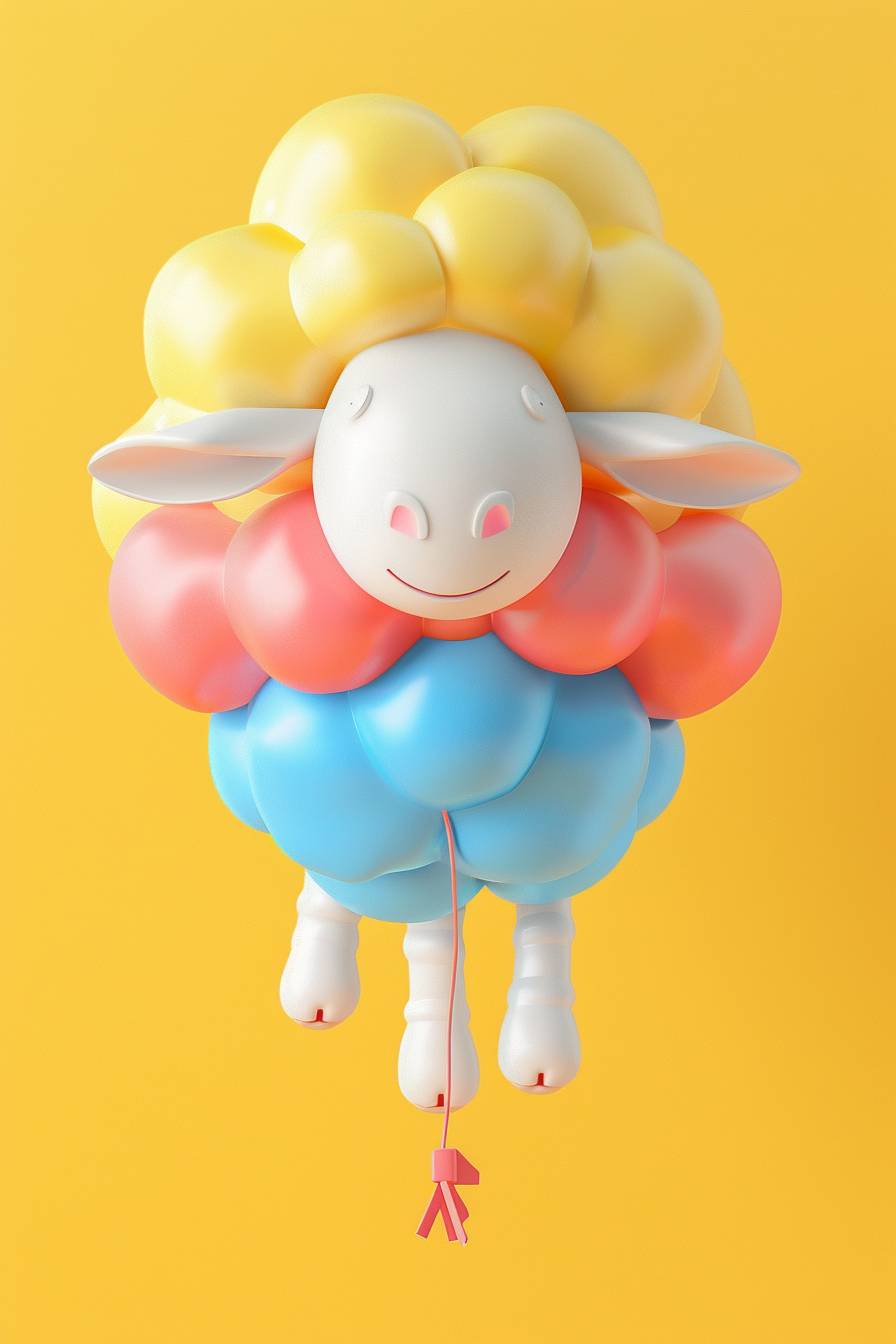 柔软触感的橡胶纹理,形状像气球的羊。背景完全是黄色的,营造出明亮而生动的外观。羊本身以蓝色、粉色和橙色的色调呈现,创造出明亮而生动的外观。