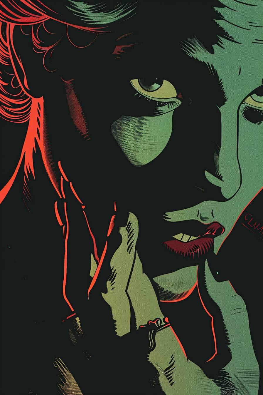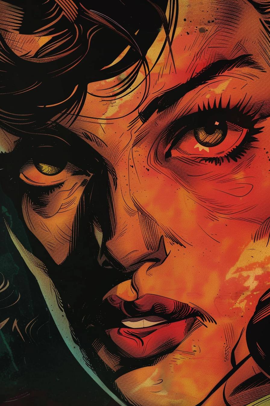 一个主题,风格为黑色漫画艺术,特写强度,黄金时代美学
