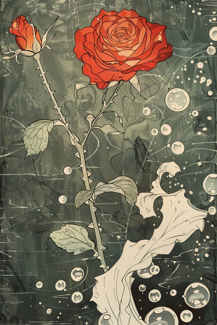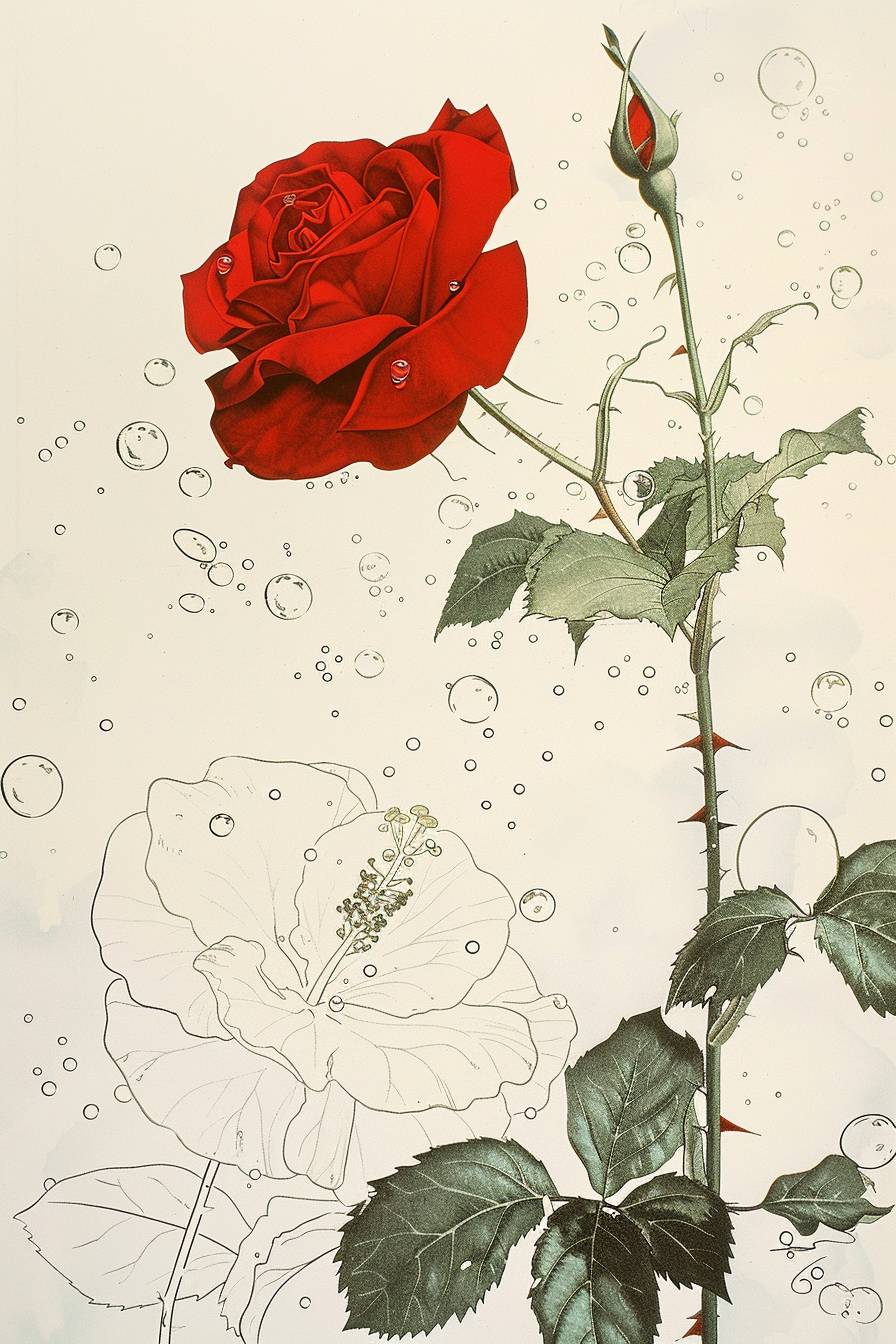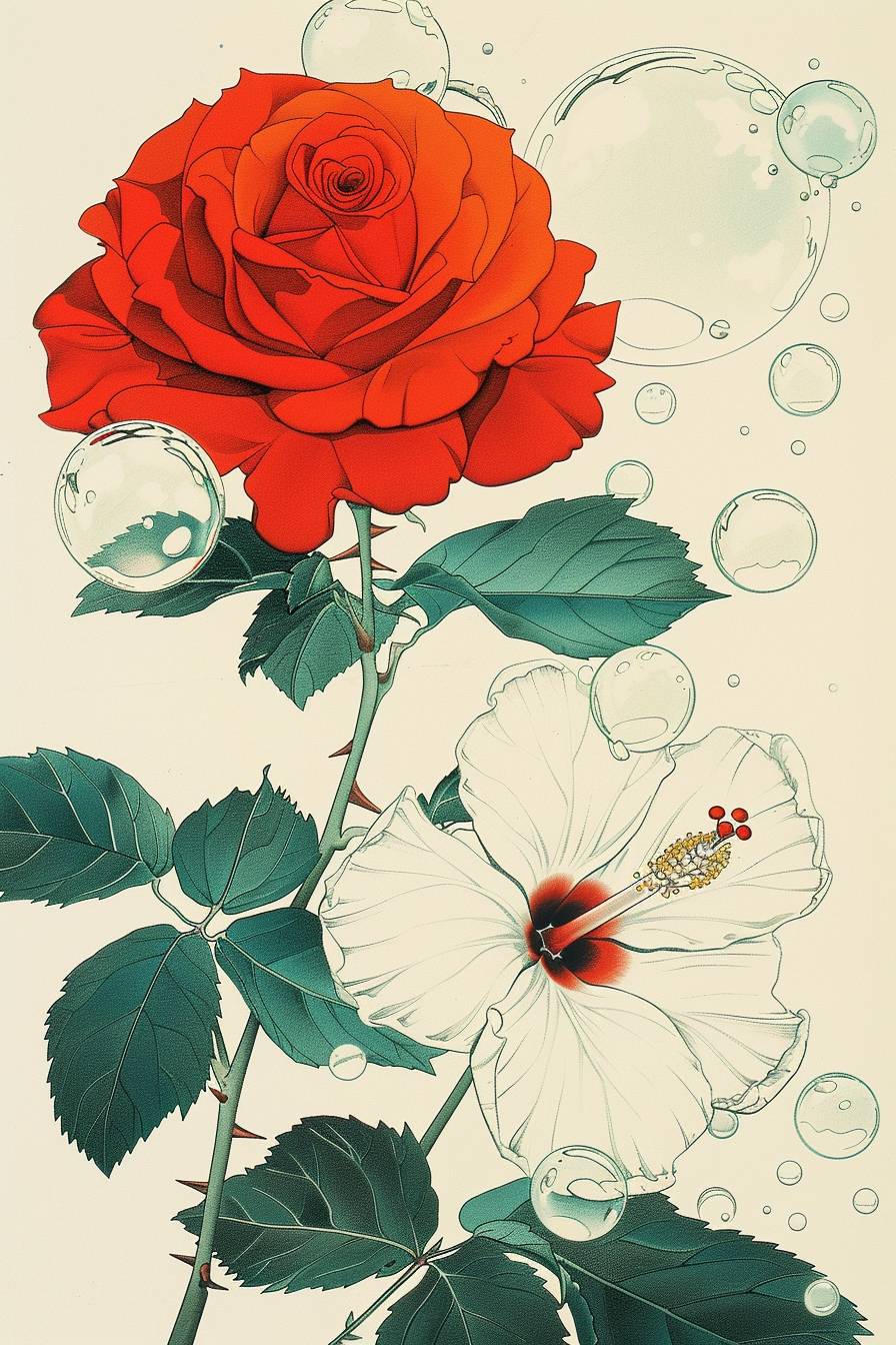 border illustration with a blank center by Jean Giraud, whimsical, clean, 1970's drawing of a red rose crossing a white hibiscus, bubbles, heavy metal--s 300 --ar 2:3 --v 6.0