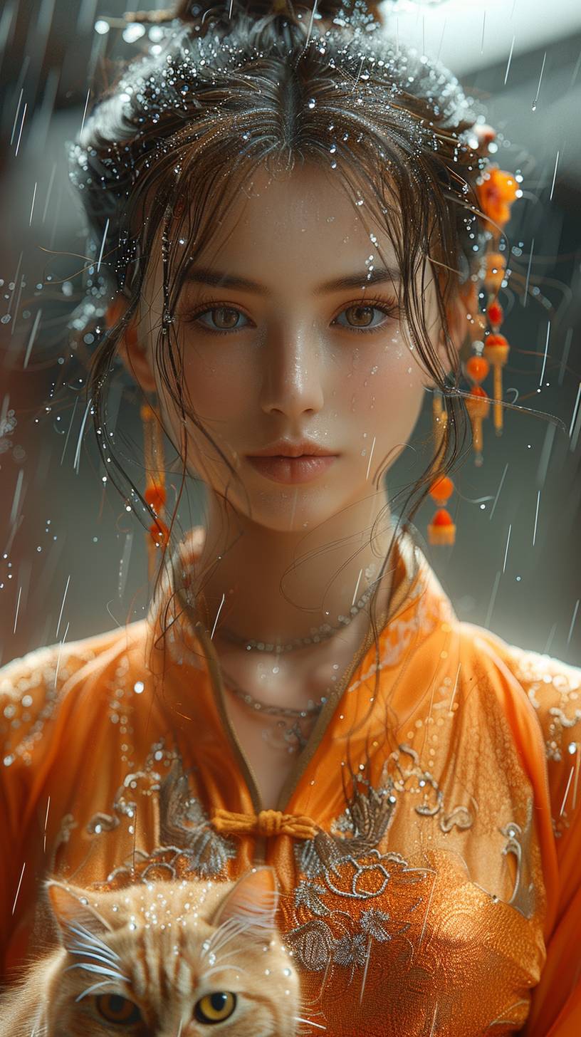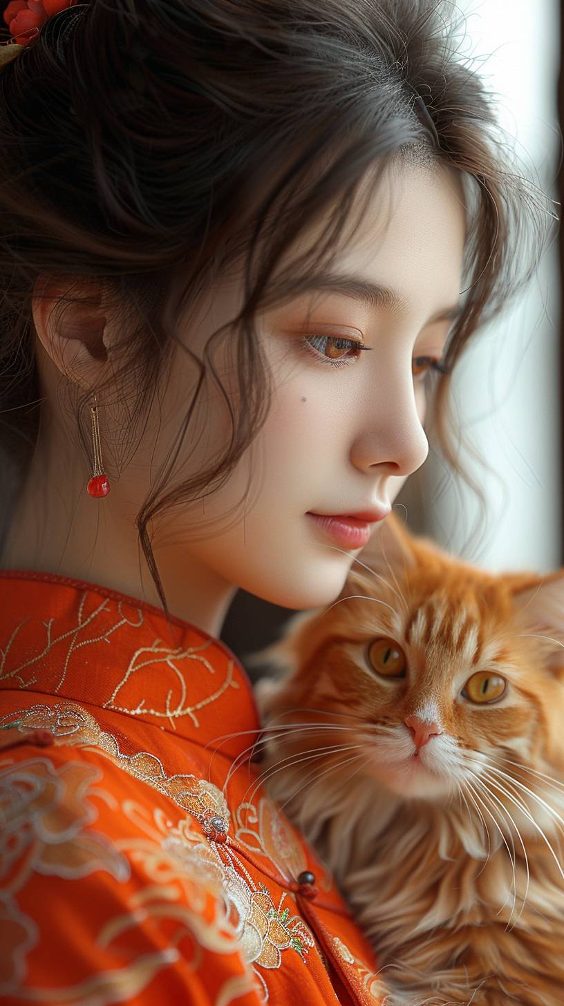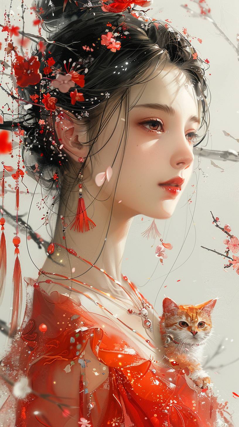 A beautiful woman in an orange dress with peach blossoms in her hair, With a fat orange cat in her arms,a Chinese style illustration with simple lines and flat painting in the ink line drawing style. A minimalist background portrait with hand drawn and hand painted details in an ultrahigh resolution, high detail flat coloring style. the style of Gongbi painting --chaos 30 --ar 9:16 --stylize 800 --v 6.0