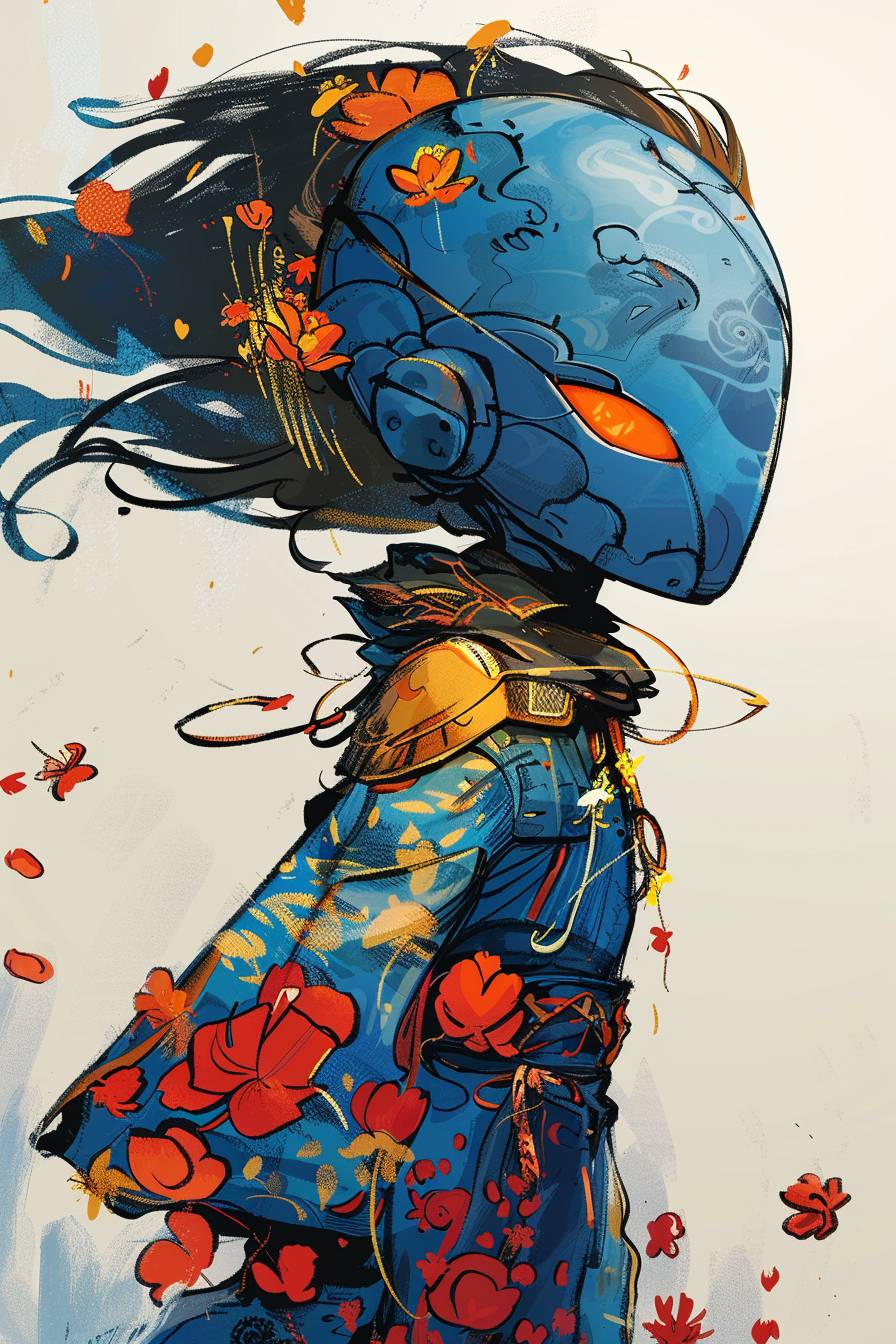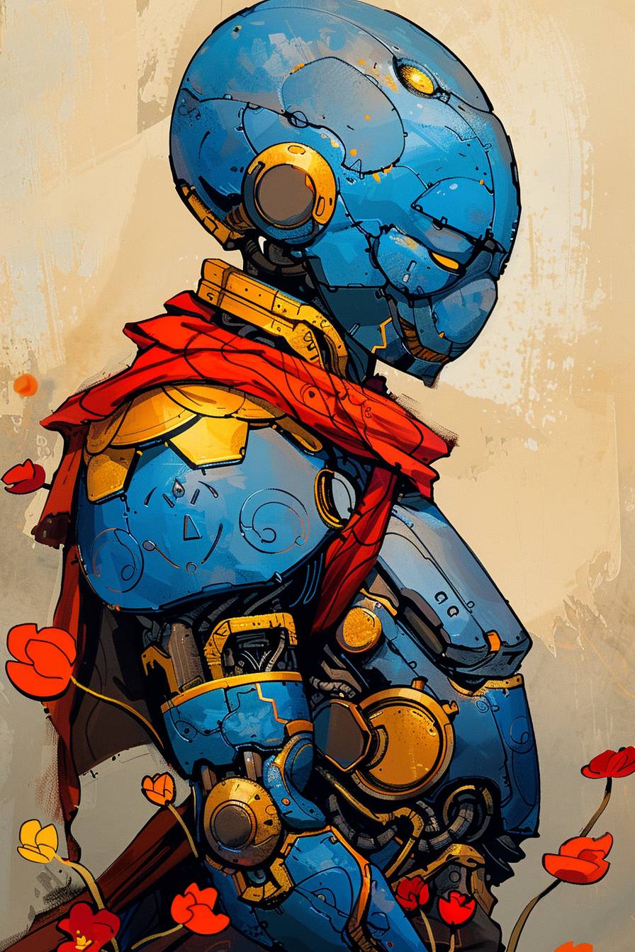 机器人的超现实主义,古代文物图案,超动态姿势,花卉图案