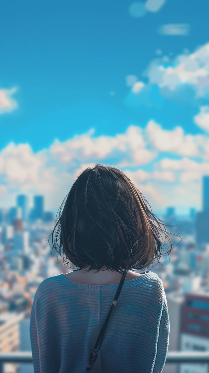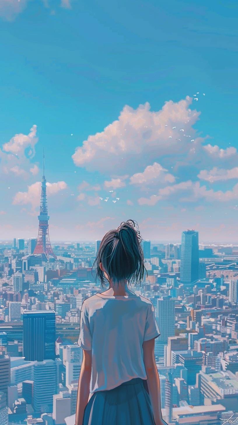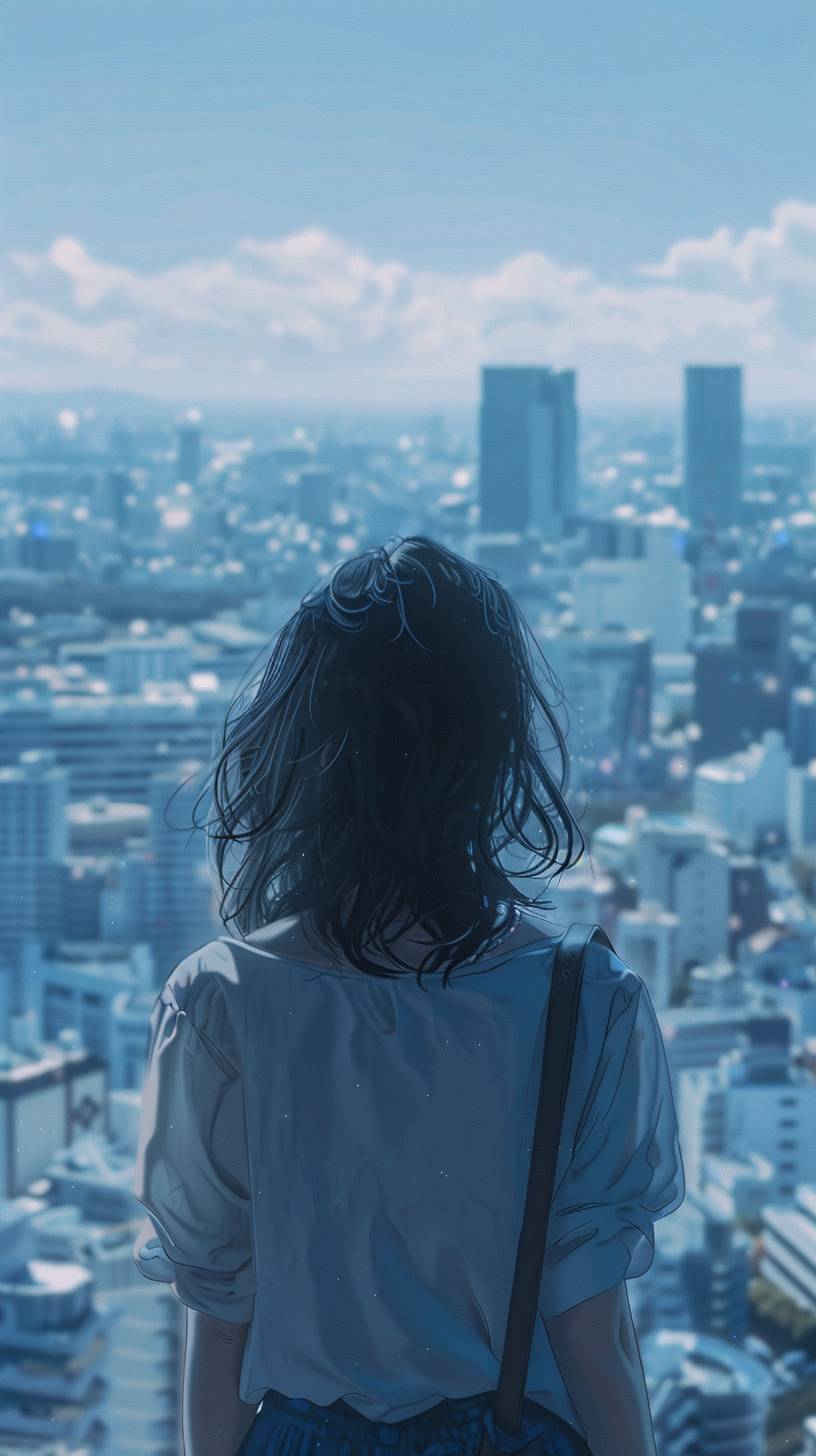 Tokyo city background, daytime, anime girl looking at view on top of building, lo-fi style, for Instagram stories, white and blue, bright soft pastel colors, youthful energy, Ghibli Studios style, dreamy lo-fi aesthetic, bright and colorful, simple and minimal, beautiful scenery, high resolution, high detail, ultra high quality, high contrast, high definition, high clarity. --ar 9:16 --v 6.0
