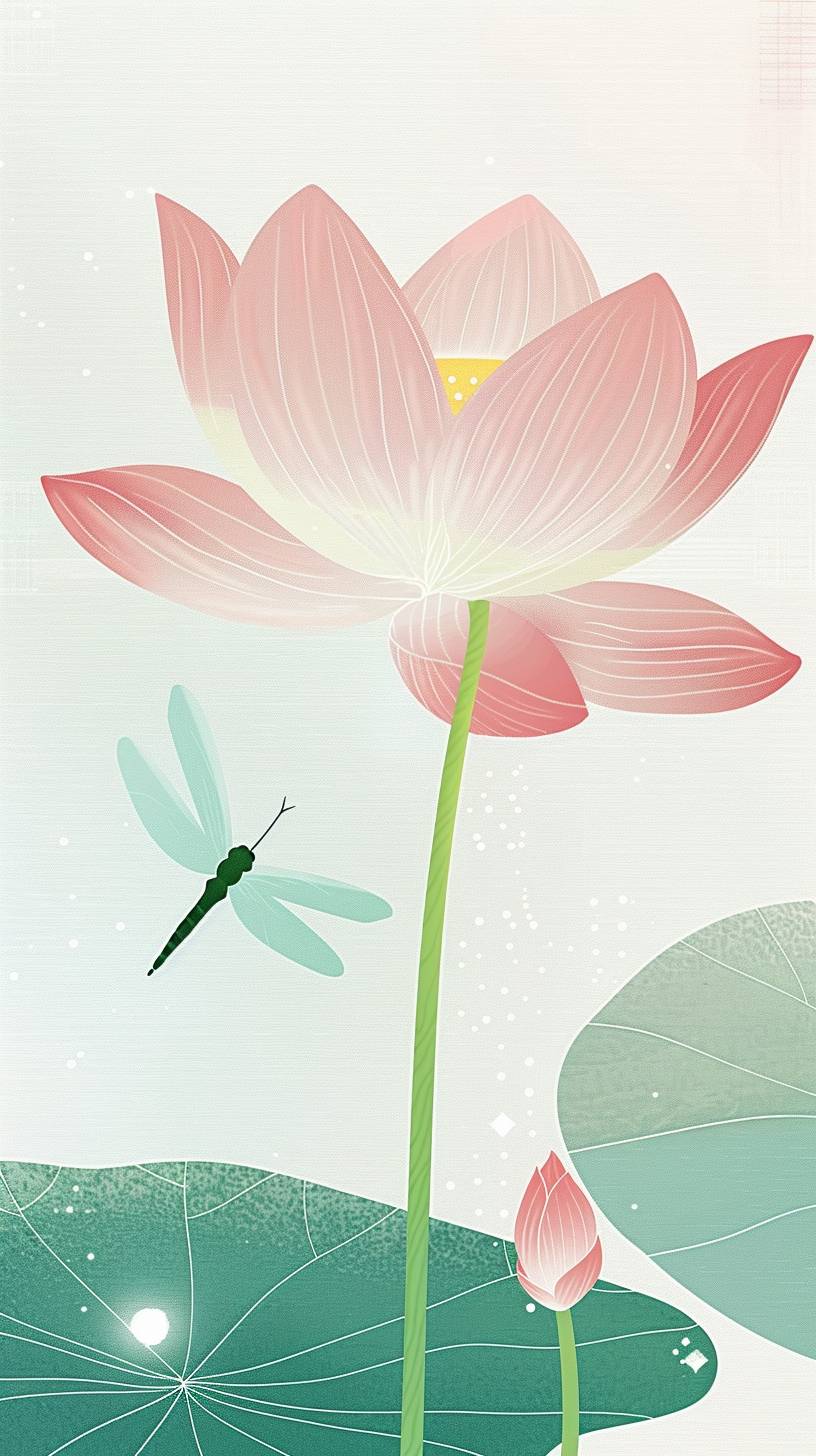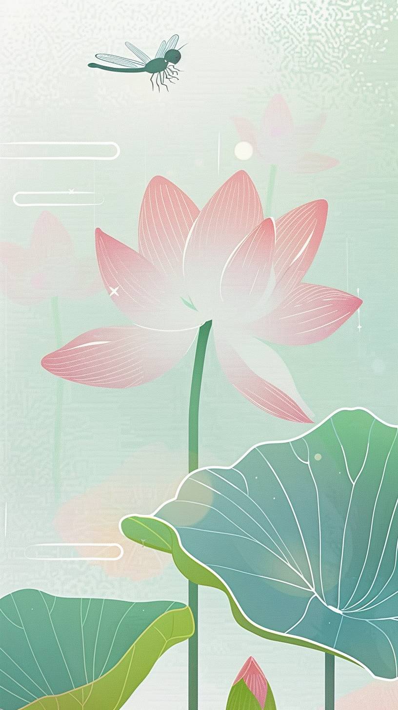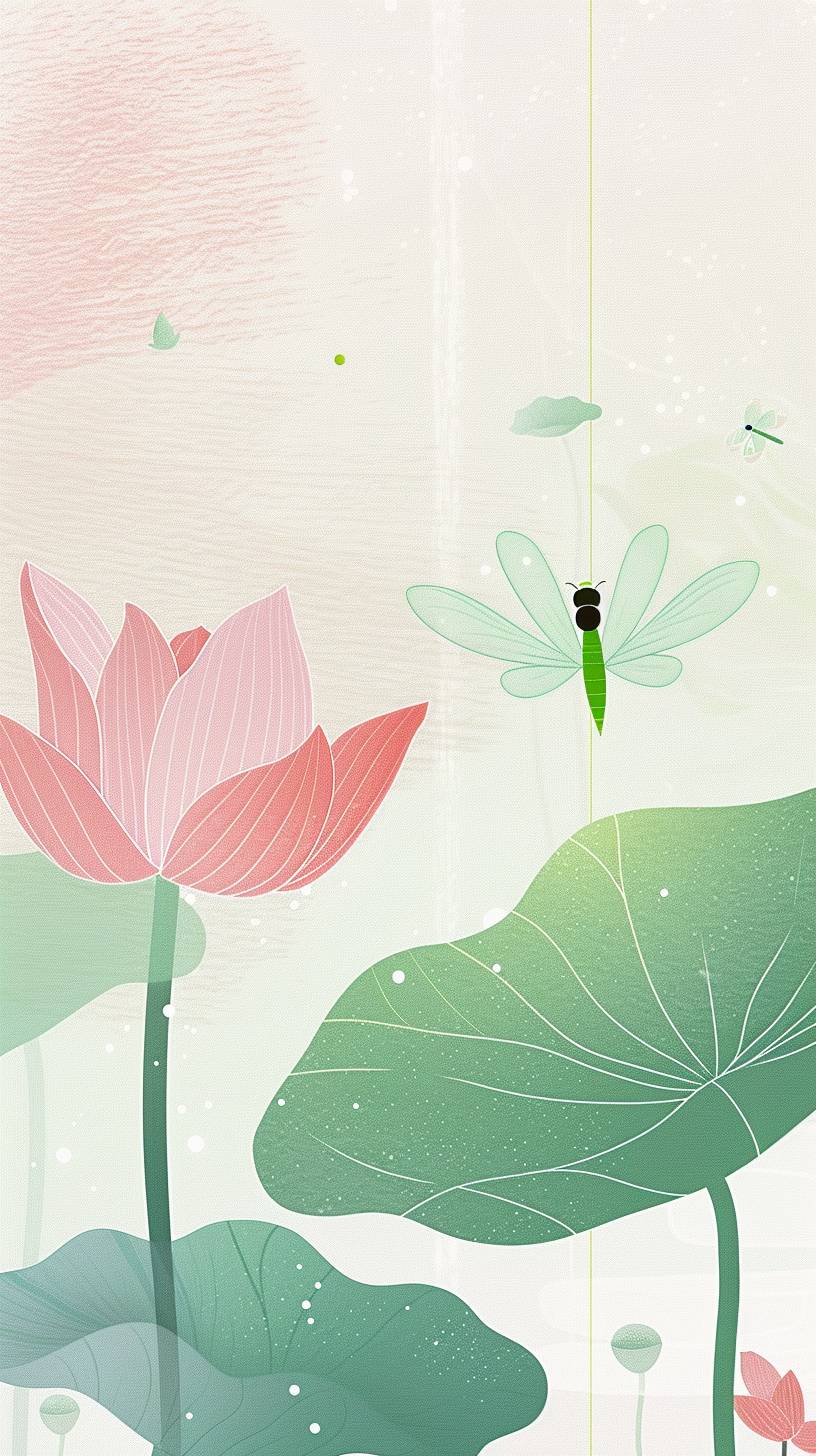 夏至,极简风格,细腻用笔,莲花与蜻蜓