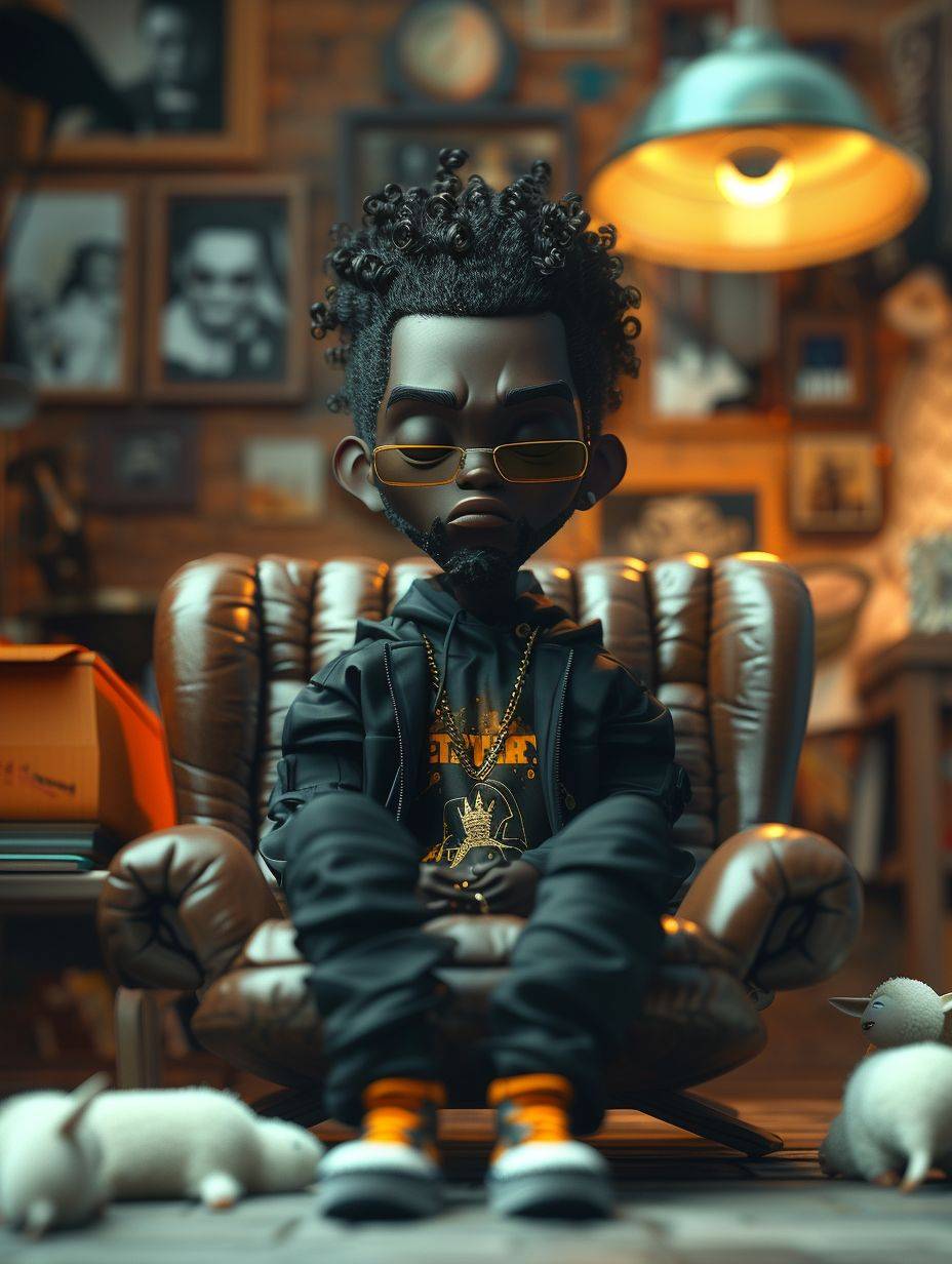 Pixar style, black T-shirt mockup with model, 3d cartoon young black man with gold teeth, wearing blank black T-shirt, wearing sunglasses, wearing a pair of cool Nike AJ shoes, very handsome and cool expression, sitting on a African witter chair, in style of pixar, [NO CHAINS OR NECKLACES], underworld brother, overlooking perspective, medium scene, background rough florida neighborhood, under street light surround by sheep,-[nothing covering shirt, no design on shirt], neo pop background, master works, Super detail, super quality, --ar 3:4 --v 6 --stylize 700