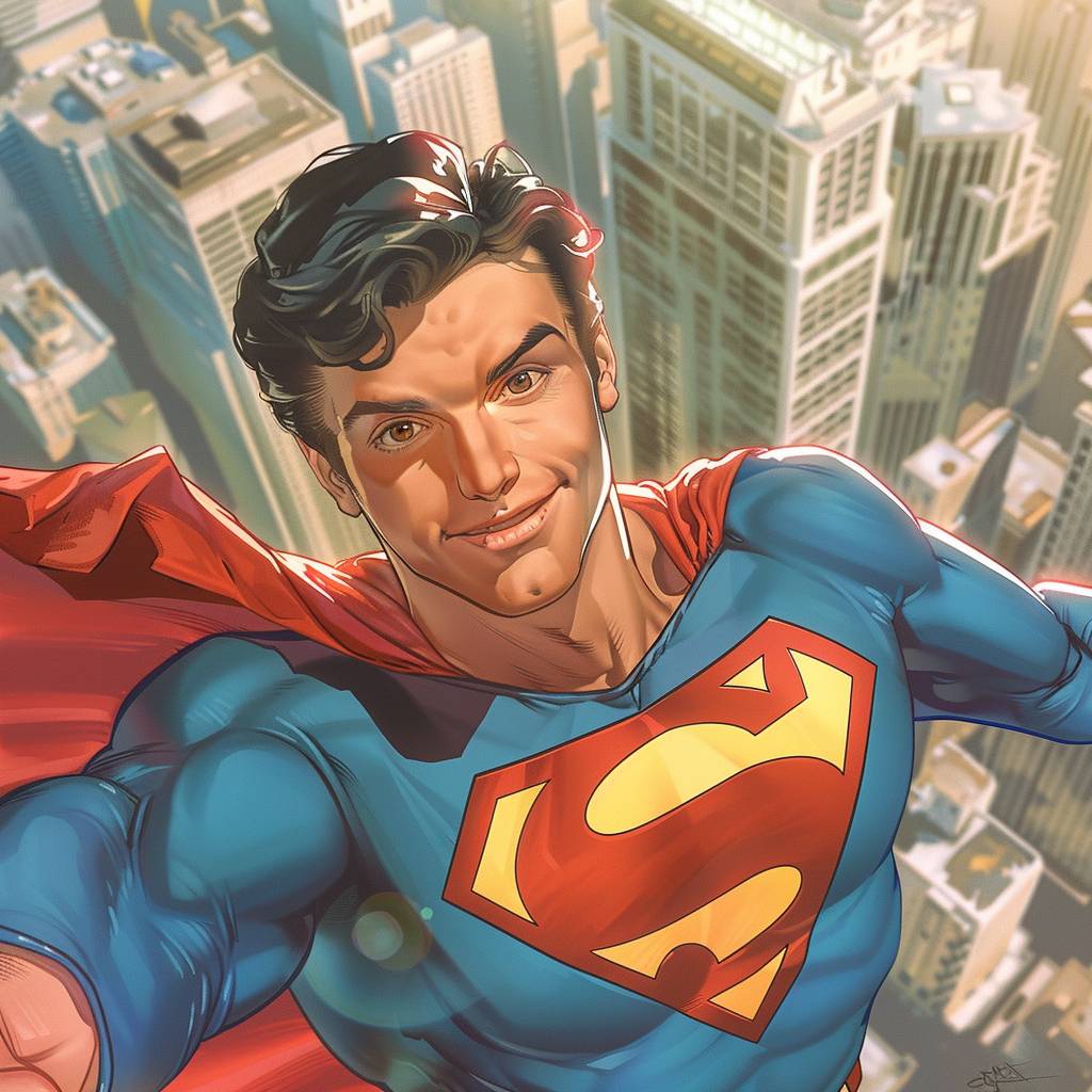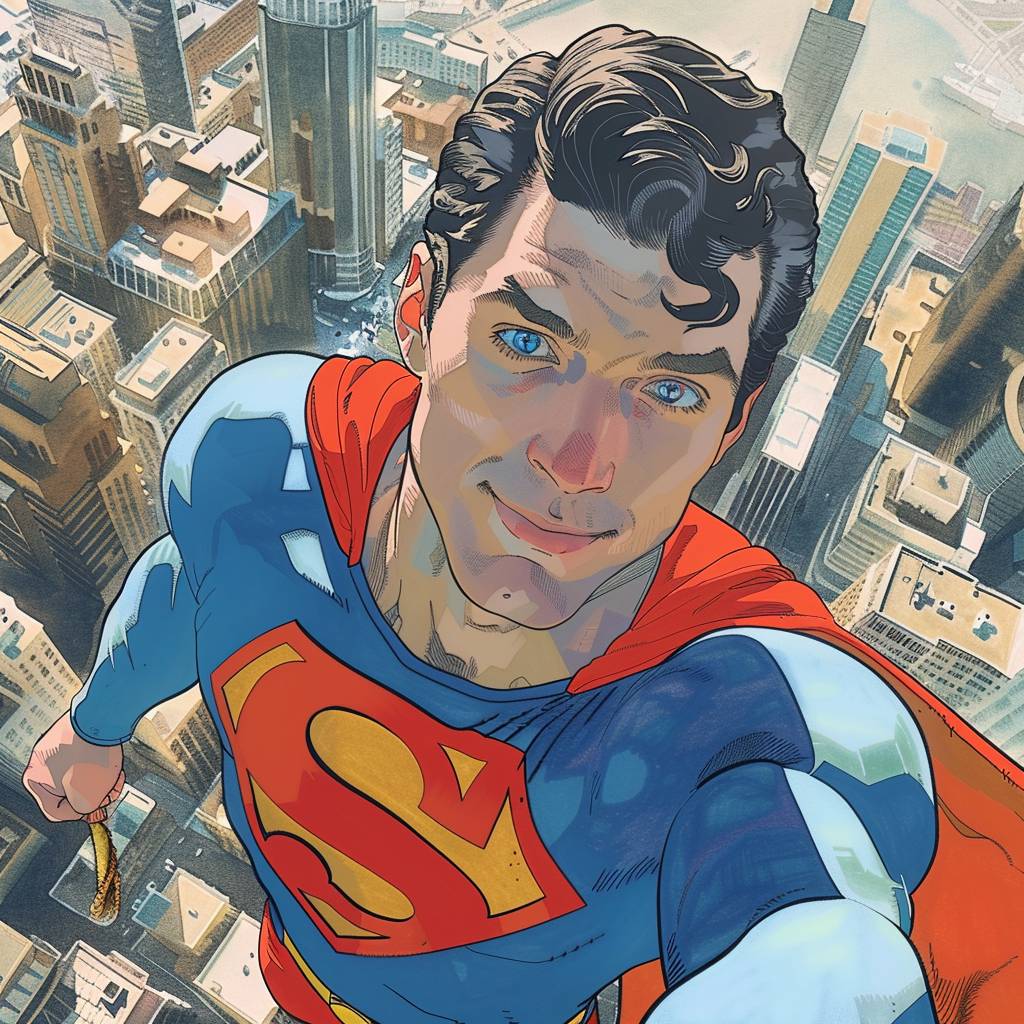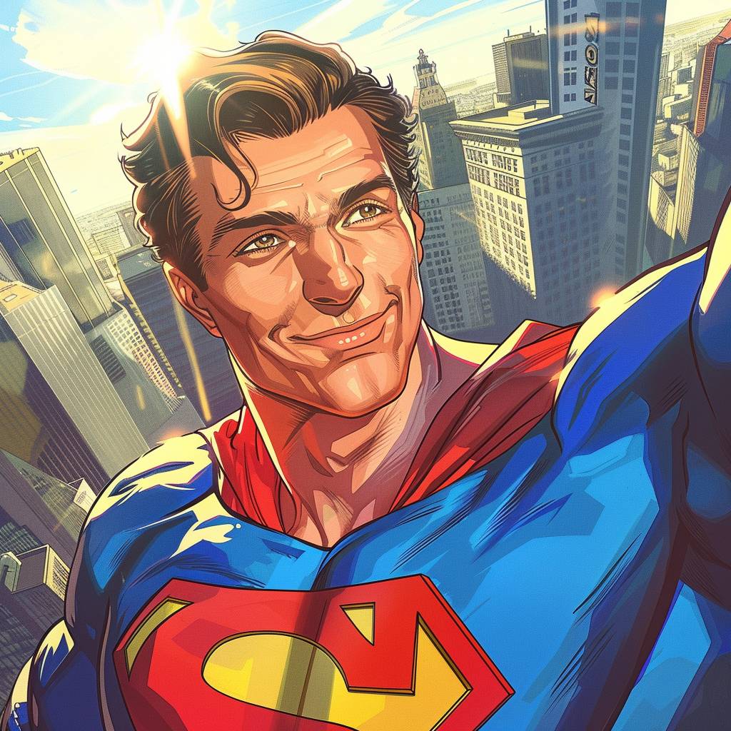 漫画书插图,超人自拍,穿着典型的蓝色超人服装,红色斗篷,背景是大都市城市,阳光明媚,DC漫画,漫画书风格,高度细致。