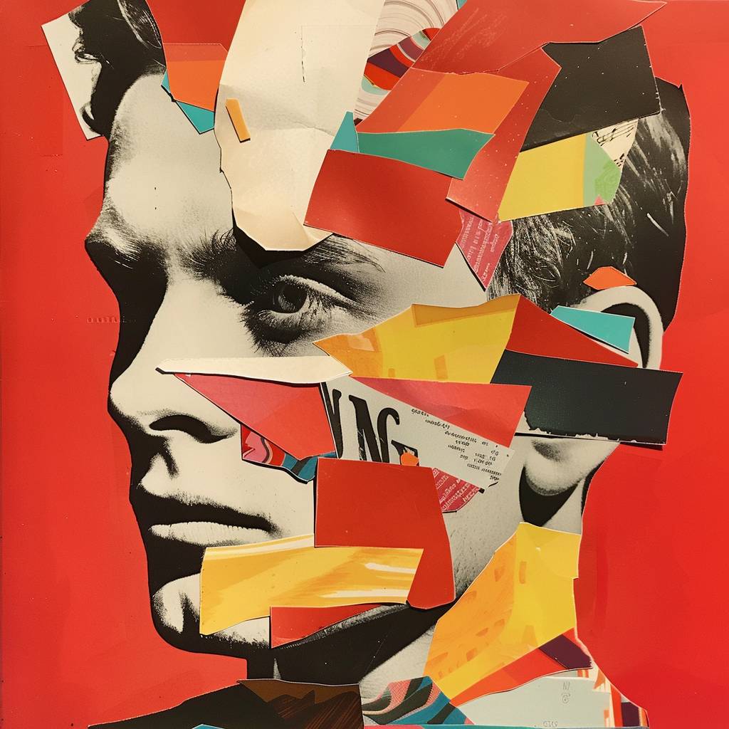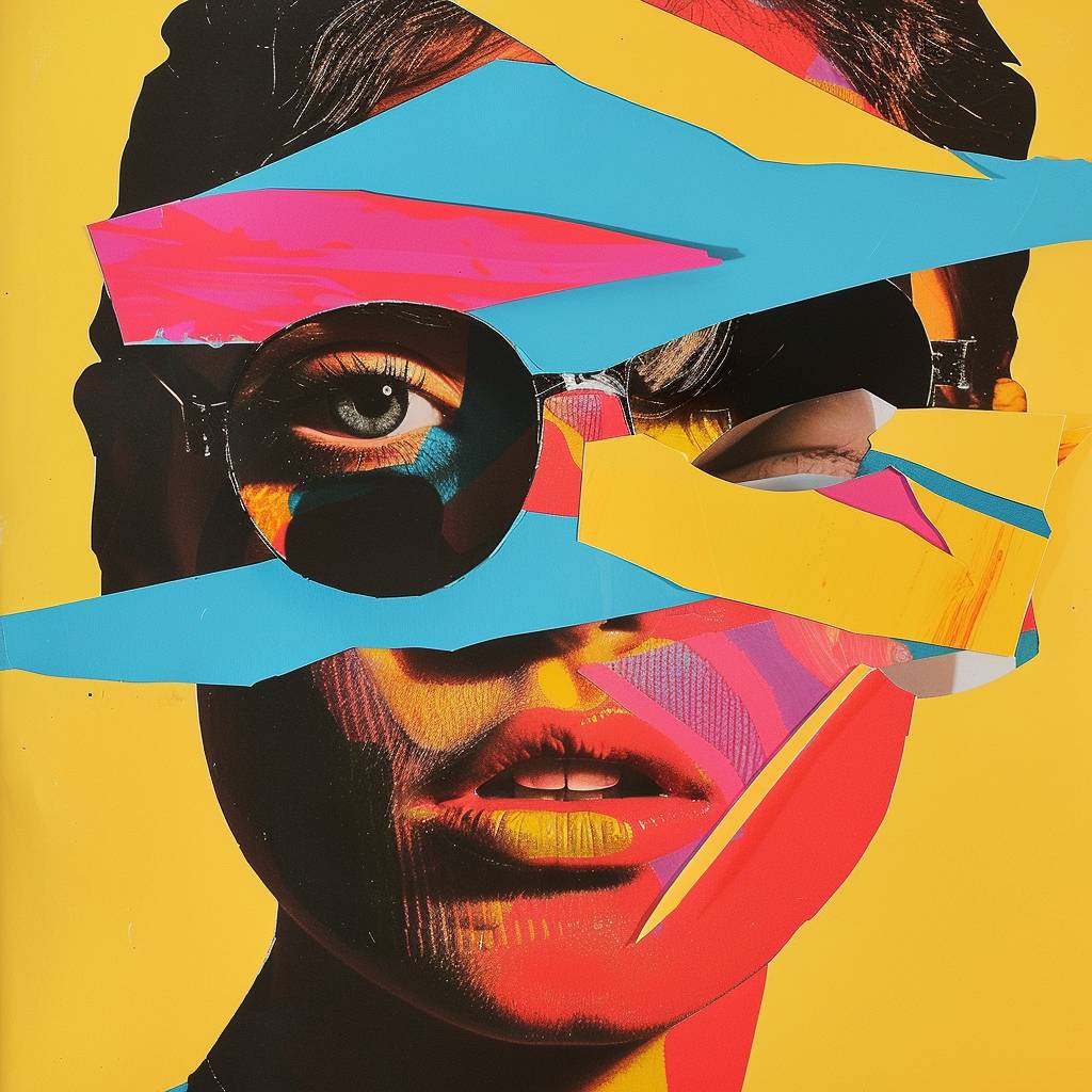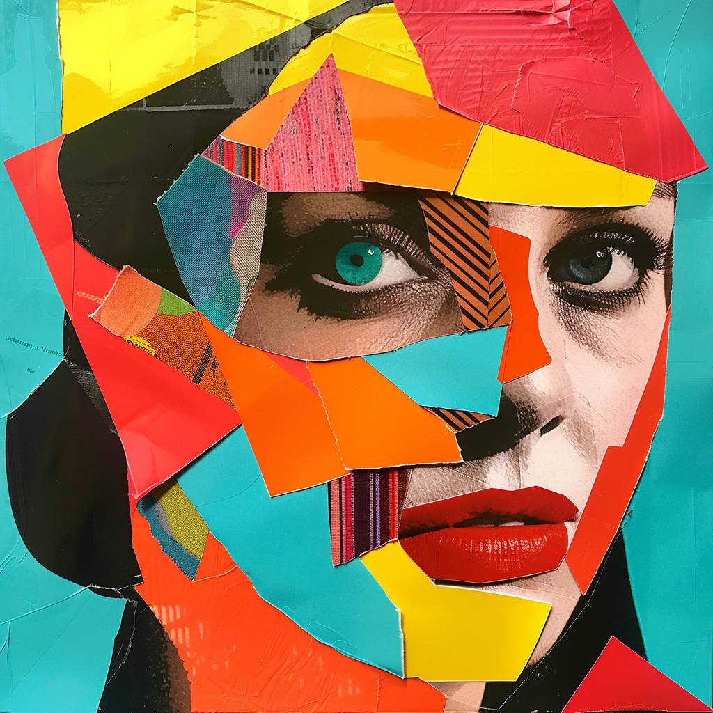 Bright [COLOR] and [COLOR] pop art collage of a [SUBJECT] with paper cutouts, high contrast --v 6.0