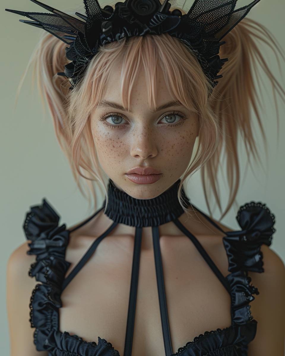 专业的工作室肖像照片,展示了一位美丽的女孩穿着受尖刺启发的橡胶服装,背景对比鲜明,极简像素时尚设计,时尚杂志编辑,Vogue,Hasselblad X2D 100C,8k,超现实的皮肤纹理,超现实的眼睛。