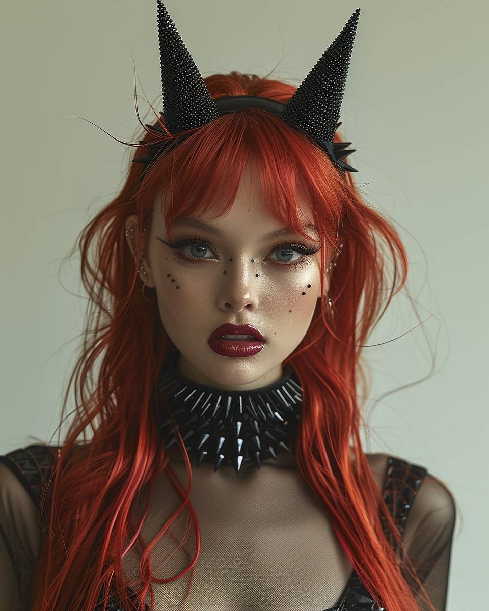 Professional studio portrait photo of a beautiful girl modelling a spike inspired rubber outfit, solid contrasting studio background, minimalist pixel fashion design, fashion magazine editorial, Vogue, Hasselblad X2D 100C, 8k, Ultra realistic skin texture, ultra realistic eyes, --ar 4:5 --stylize 950 --v 6.0