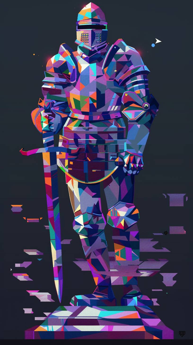 一座骑士神像的像素艺术,背景是战场,采用多彩色调渲染。作品构图简单却视觉上吸引,以其干净的线条和几何形状而著称。