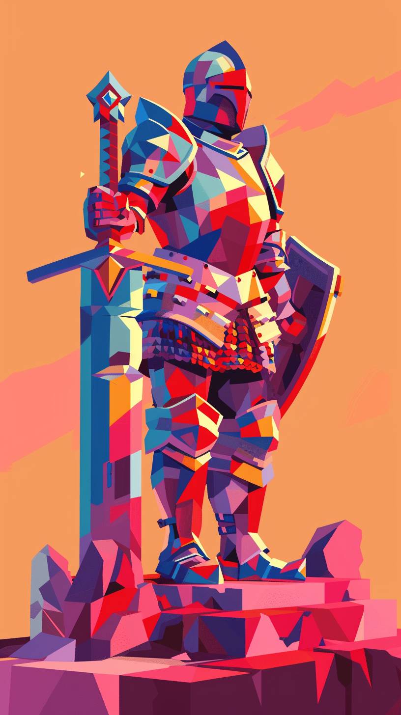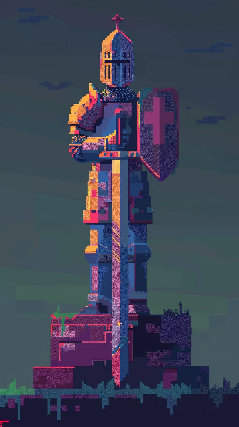 a pixel art of a templar knight statue with battlefield, rendered in colorful shades. The composition is simple yet visually appealing with its clean lines and geometric shapes. --ar 9:16 --stylize 50 --v 6.0