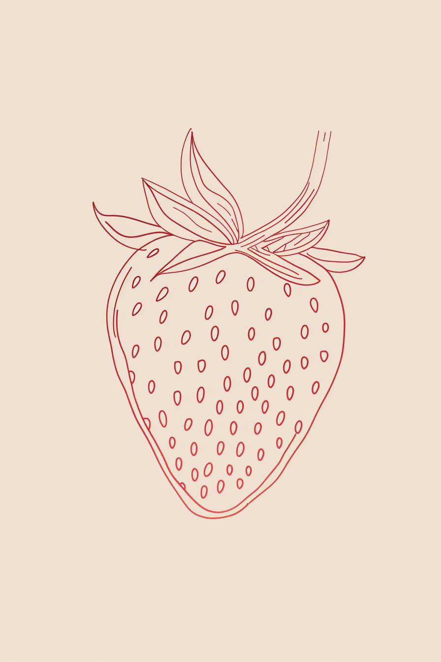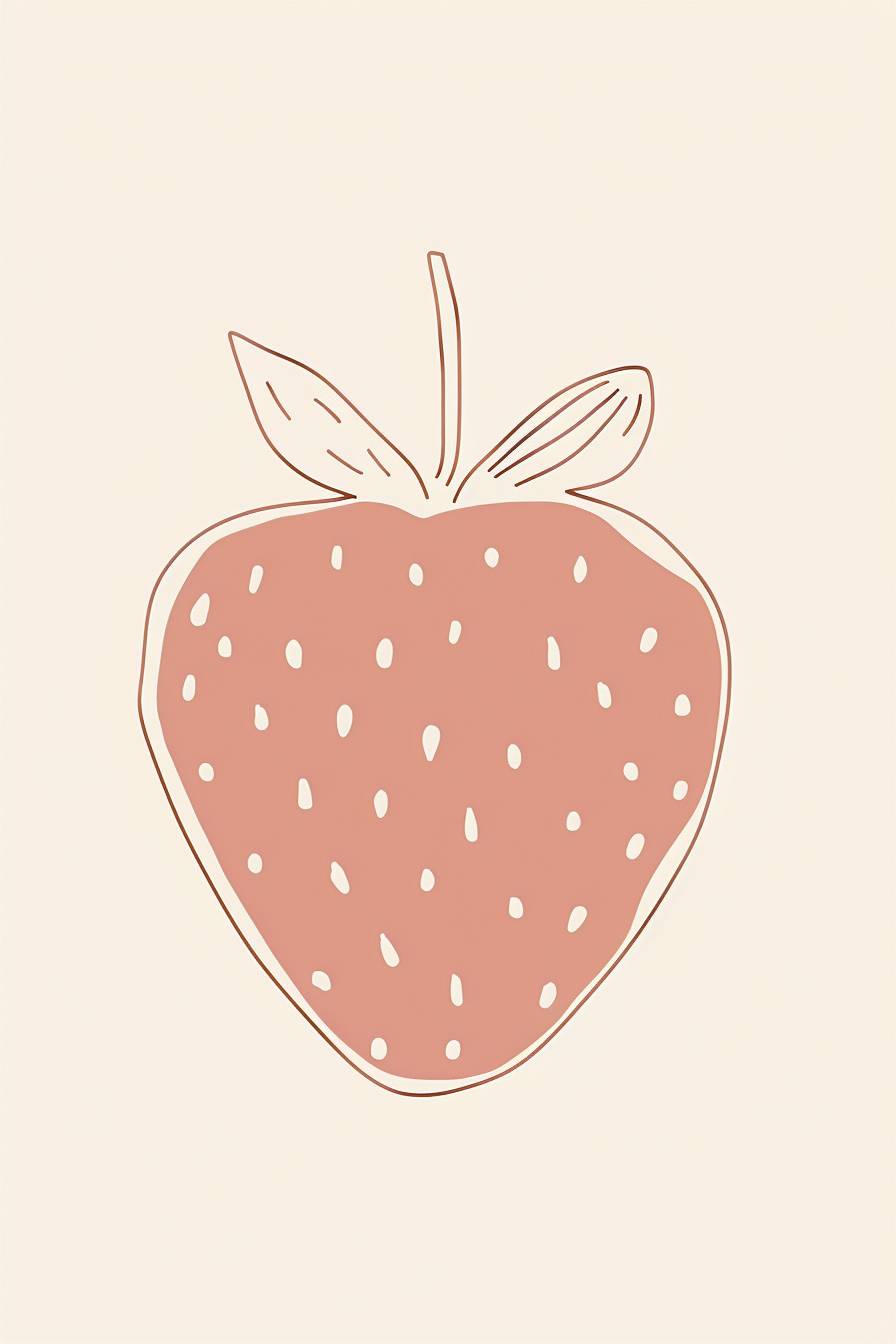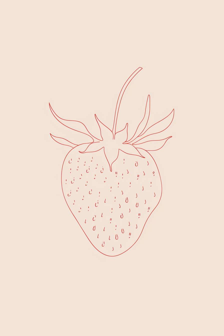 一只小草莓的极简线条艺术,线条是浅粉色的,种子是点状的,草莓是深粉色的,背景是奶油色的。