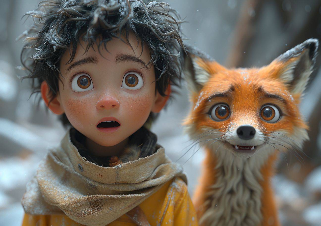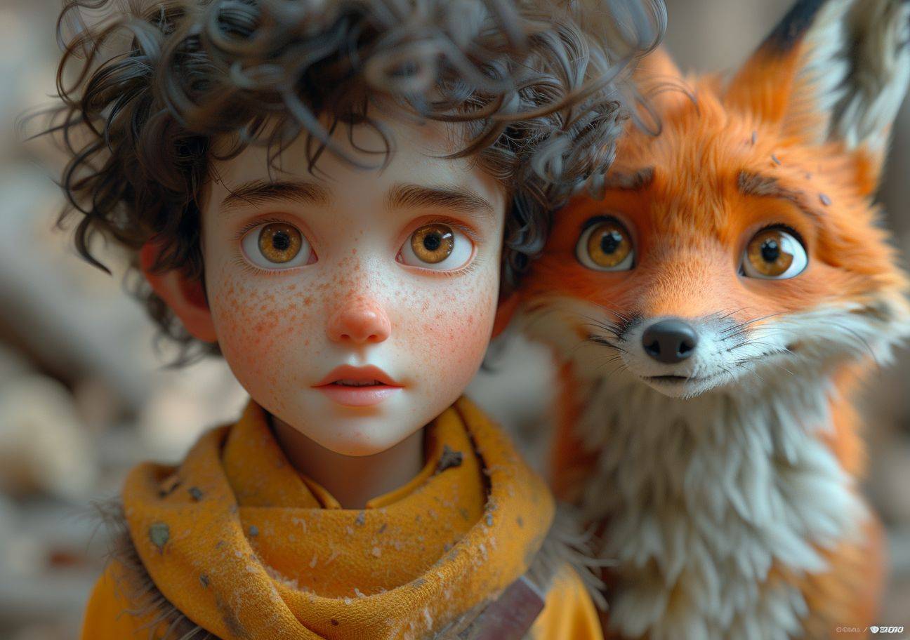 一个穿着黄色衬衫、留着卷发的男孩与一只狐狸交谈,画面充满魅力和戏剧性的阴影。
