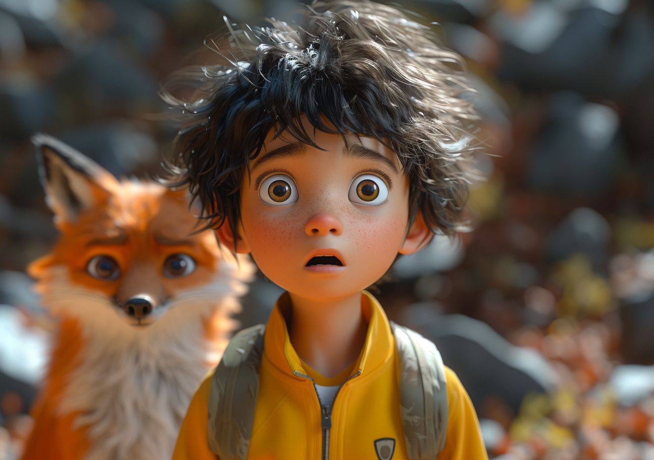 一个男孩,卷曲的头发,穿着黄色的衬衫,以Cinema4D渲染风格,迷人的角色,我简直无法相信这有多美,鲁道夫·贝拉斯基,快速而难以察觉的细节,戏剧性的阴影,卡通式的画像,正在和一只狐狸交谈。