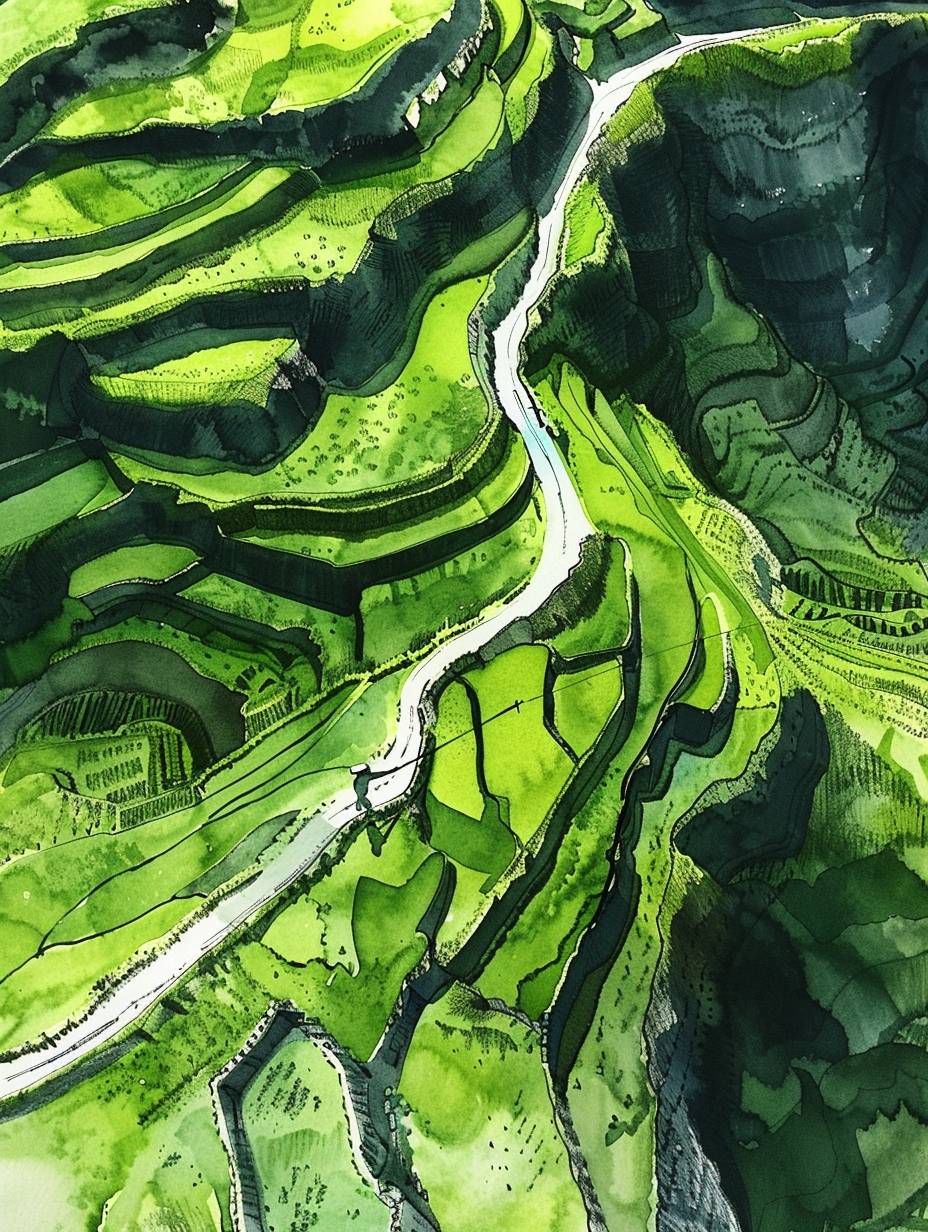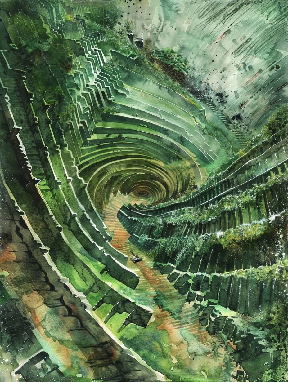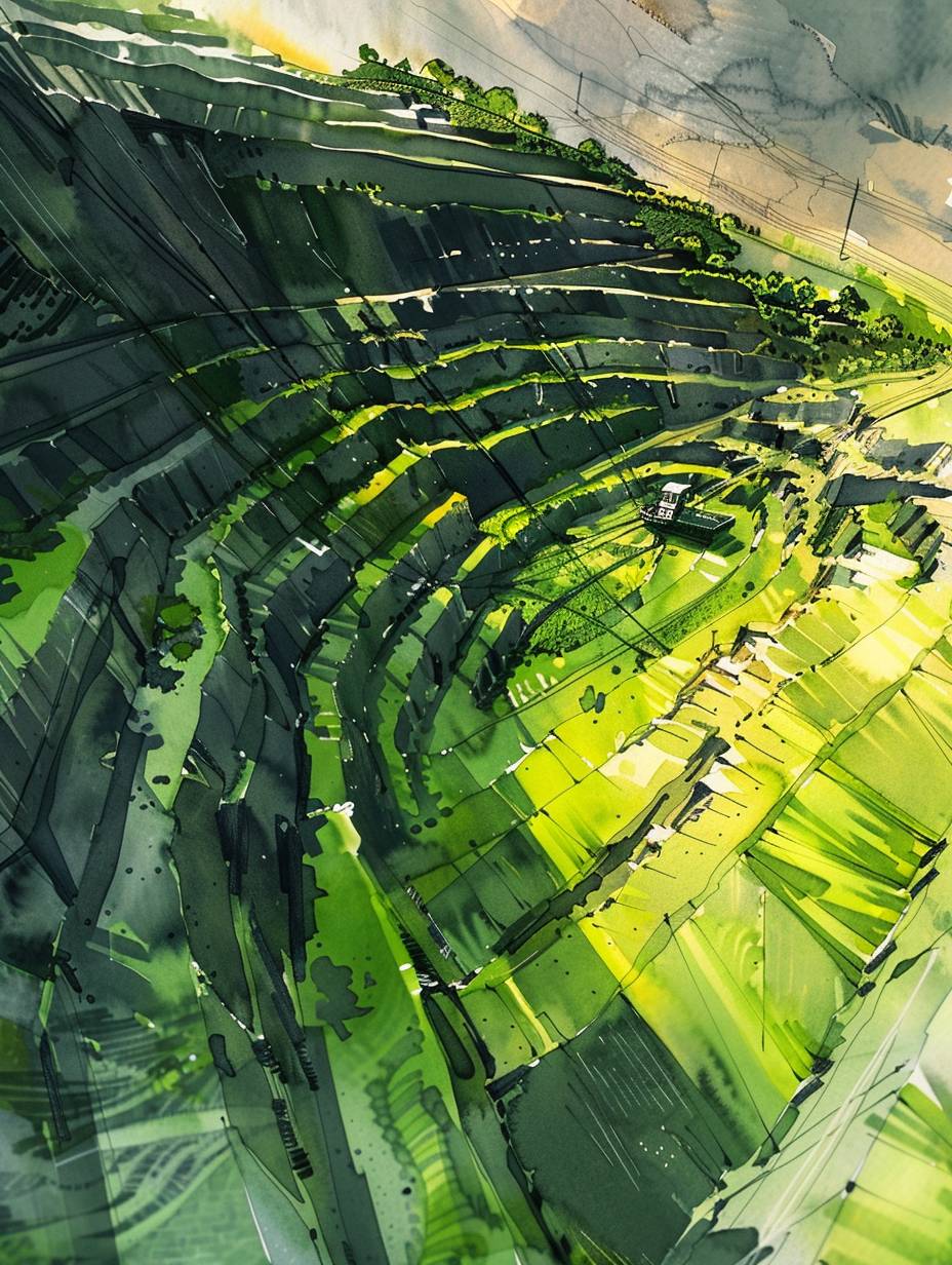 3D rendering of Green mine, terraced structure, coal miners are mining, tramcar driving on the road, sunshine, spring, top view, drone view, ultra wide angle,watercolor ink painting, --ar 3:4 --v 6.0