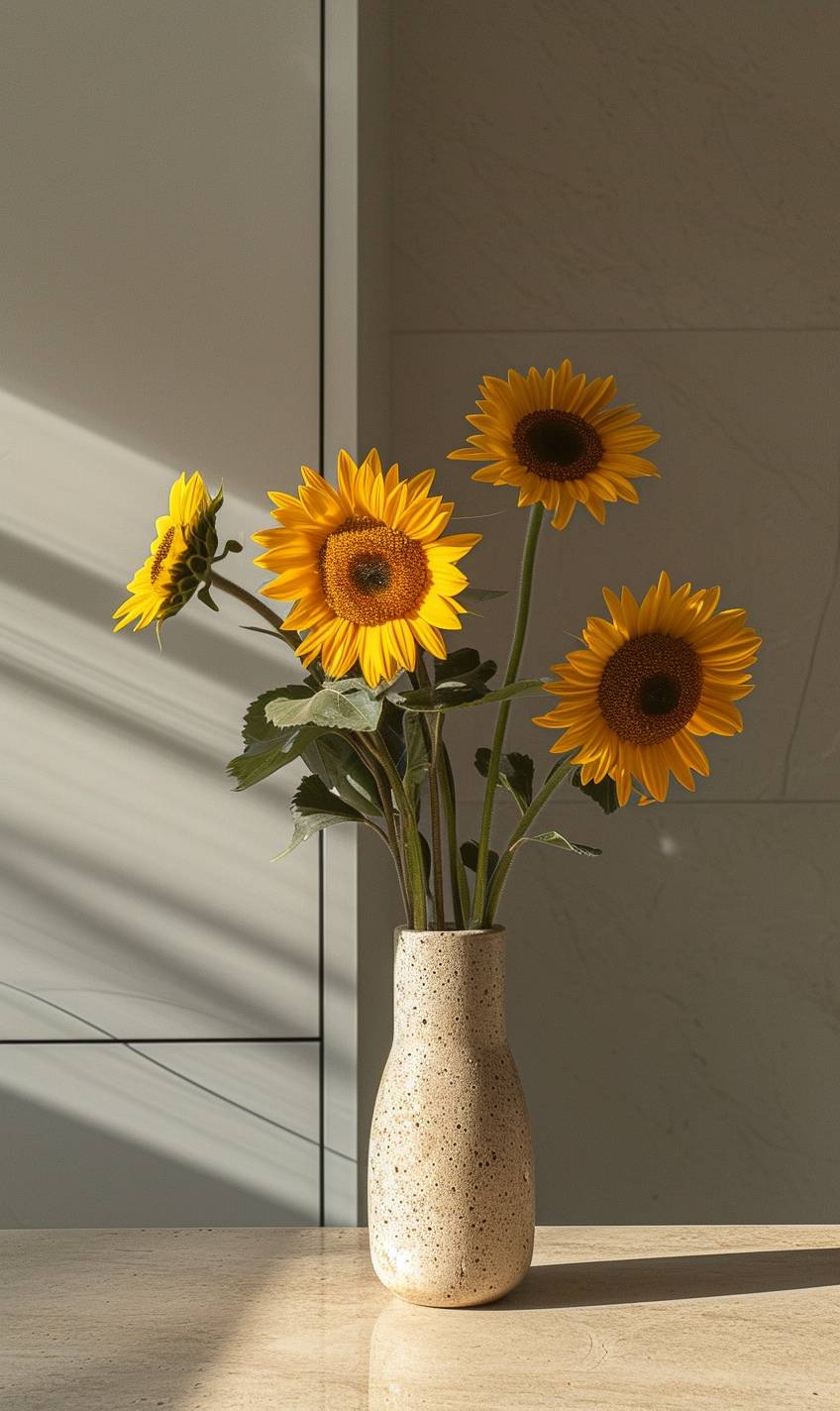 a photorealistic photo taken with a high quality camera of a beautiful still life arrangement featuring a bouquet of sunflowers in a vase on a table in a modern apartment. --ar 3:5 --quality 0.5 --v 6.0