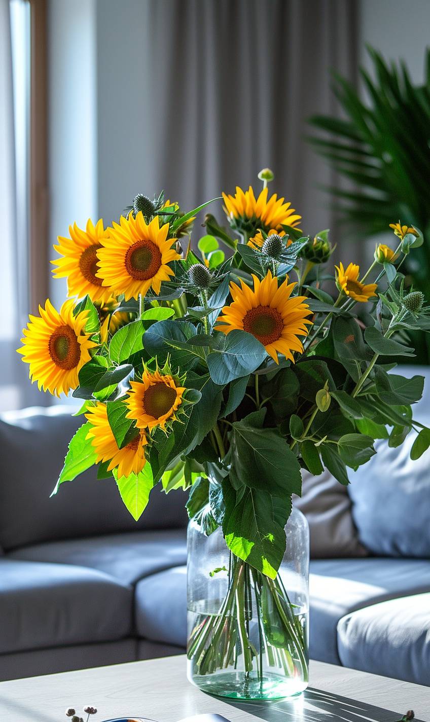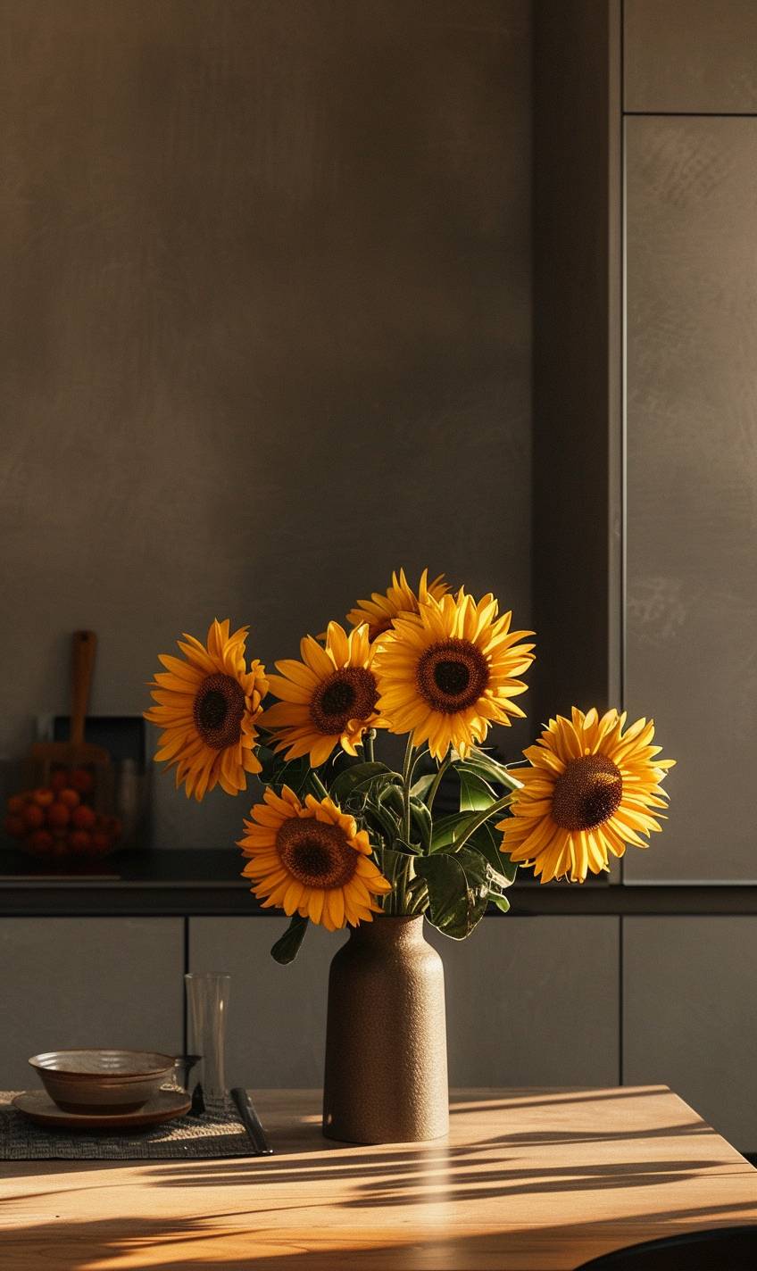 一张用高质量相机拍摄的超现实主义照片,展示了一个现代公寓中的桌子上摆放着一个装满向日葵的花瓶的美丽静物摆设。