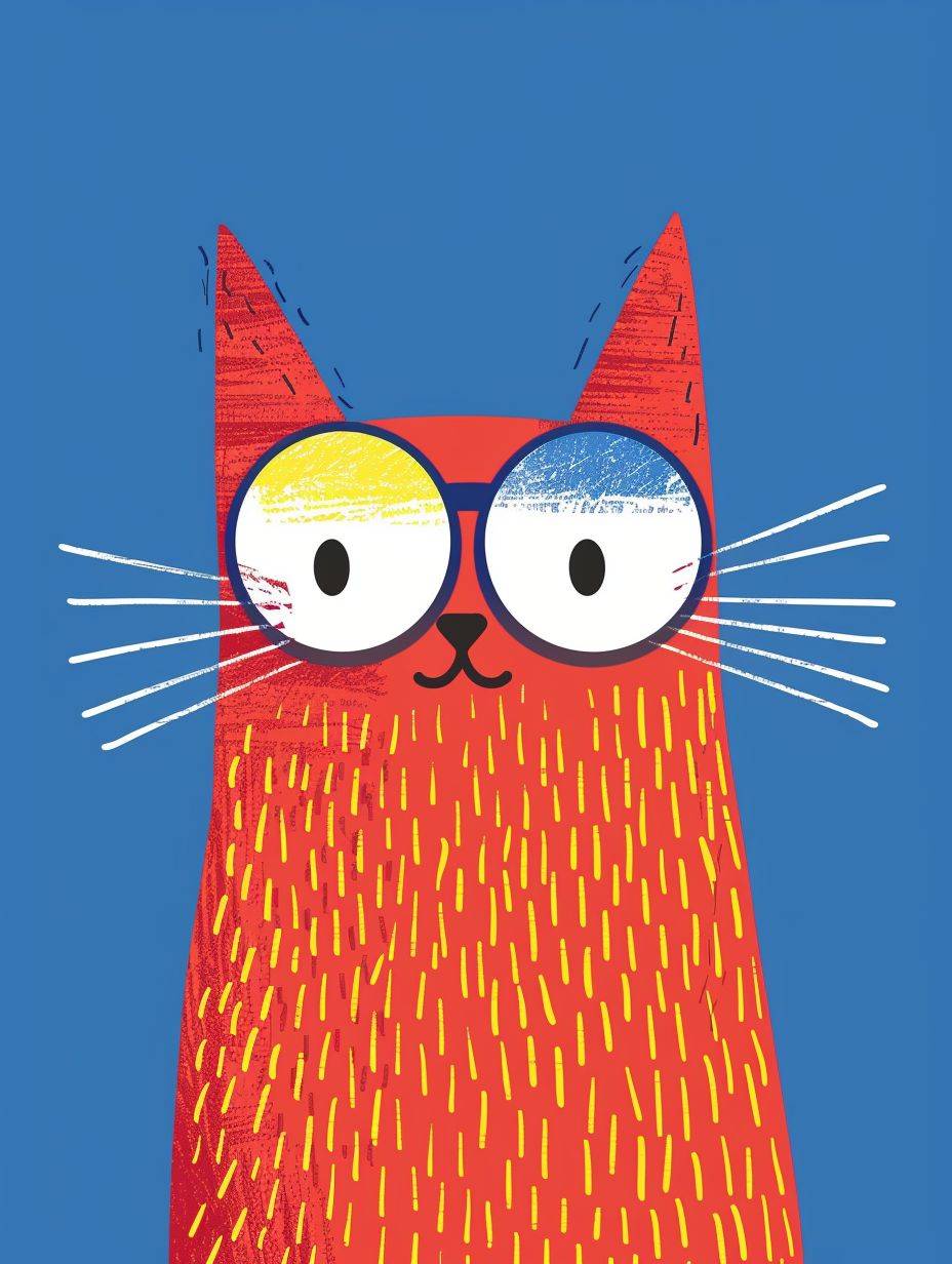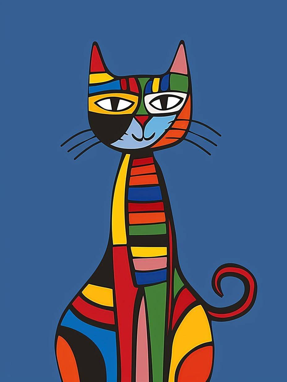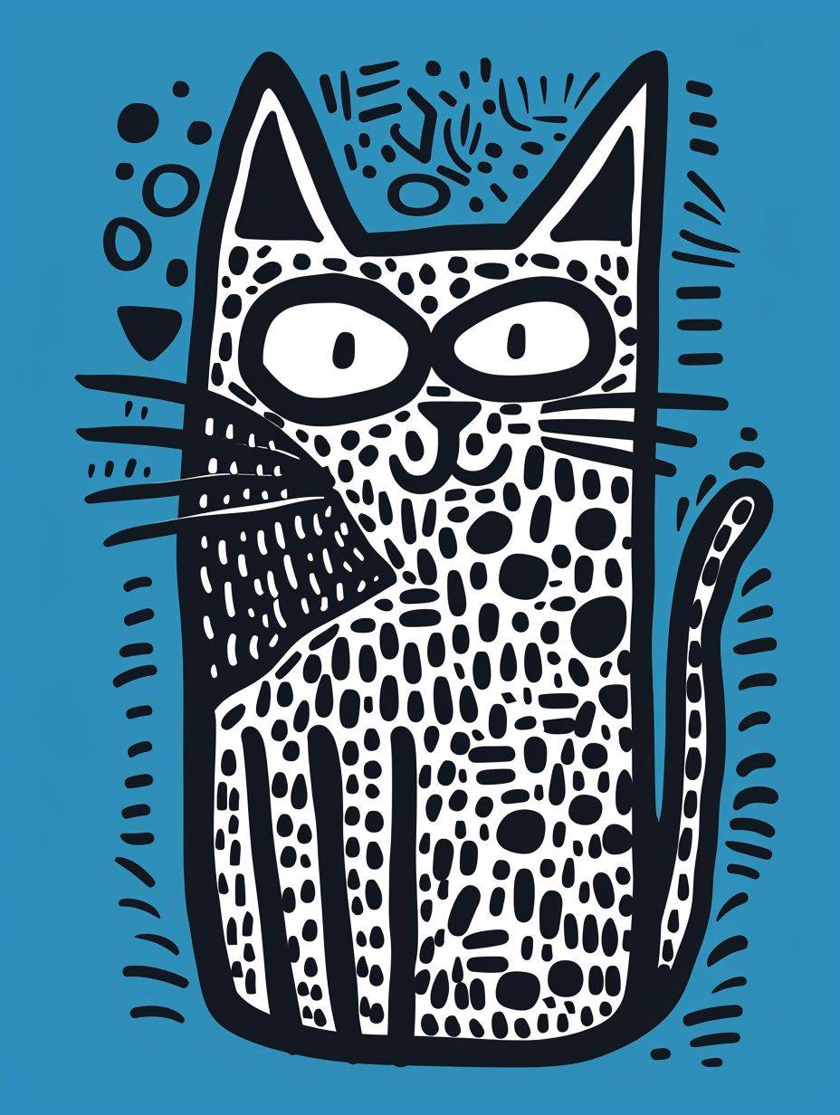 一幅简单的全身猫咪插画,蓝色背景,凯斯·哈林风格,使用马克笔绘制,线条粗犷,色彩鲜艳,细节简约。