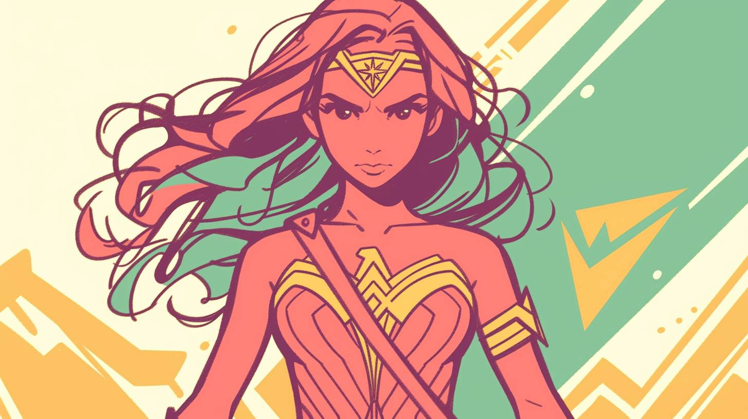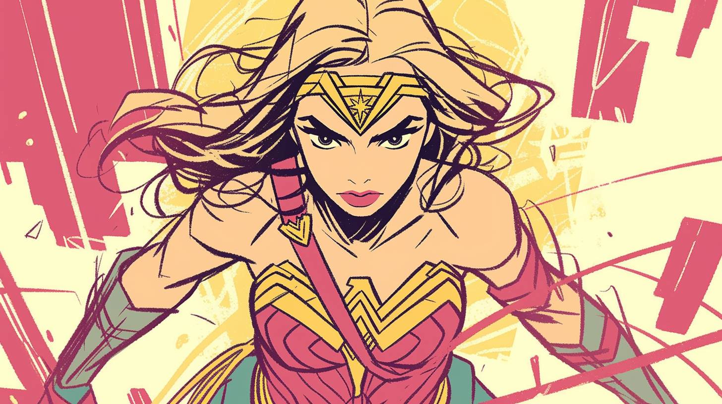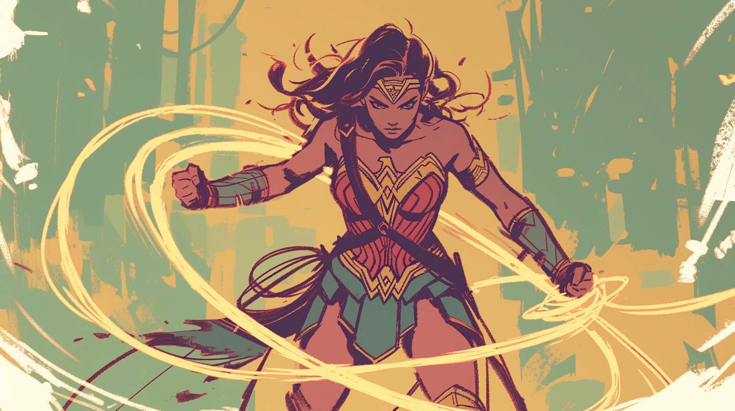 wonder woman, in the style of bold and graphic compositions, mosaic-like collages, pop culture mashup, multiple screens, light red and light bronze, magali villeneuve, macro zoom, outlandish energy, contemporary frescoes, chaotic academia, digital as manual --ar 16:9 --style raw --sref 3035259247 --stylize 1000 --niji 6