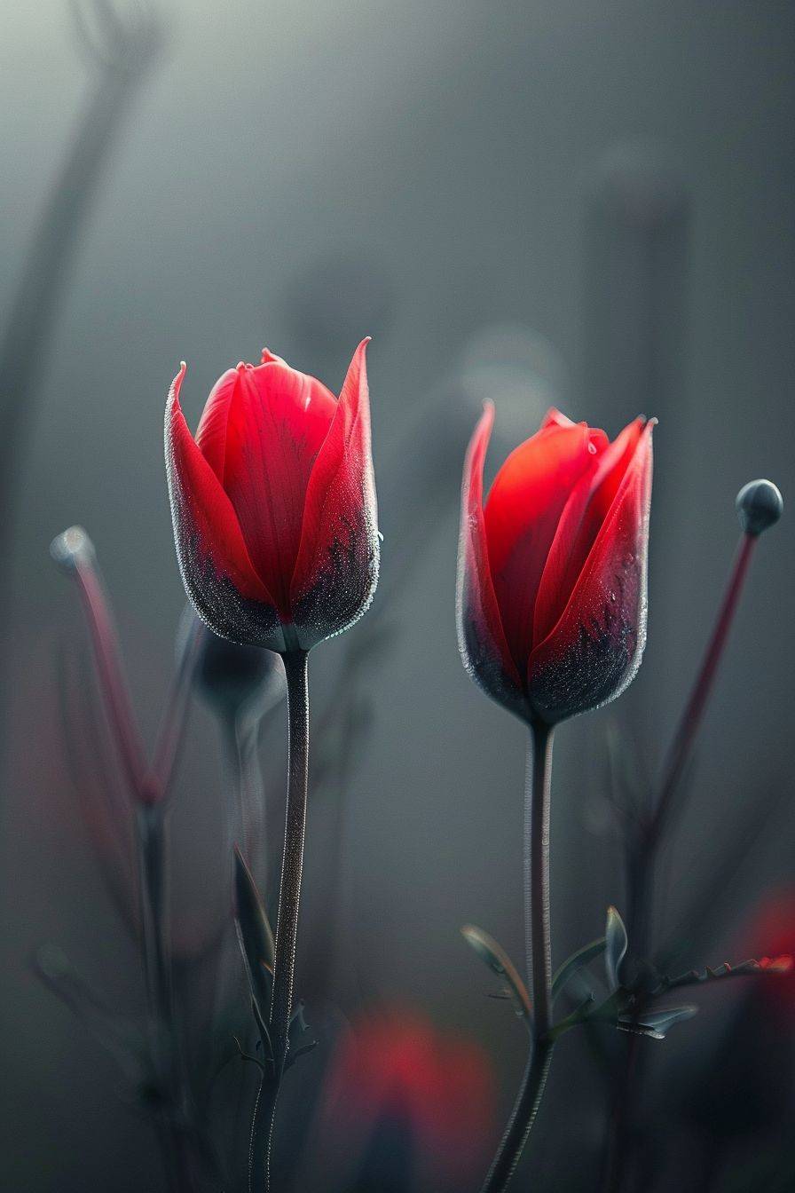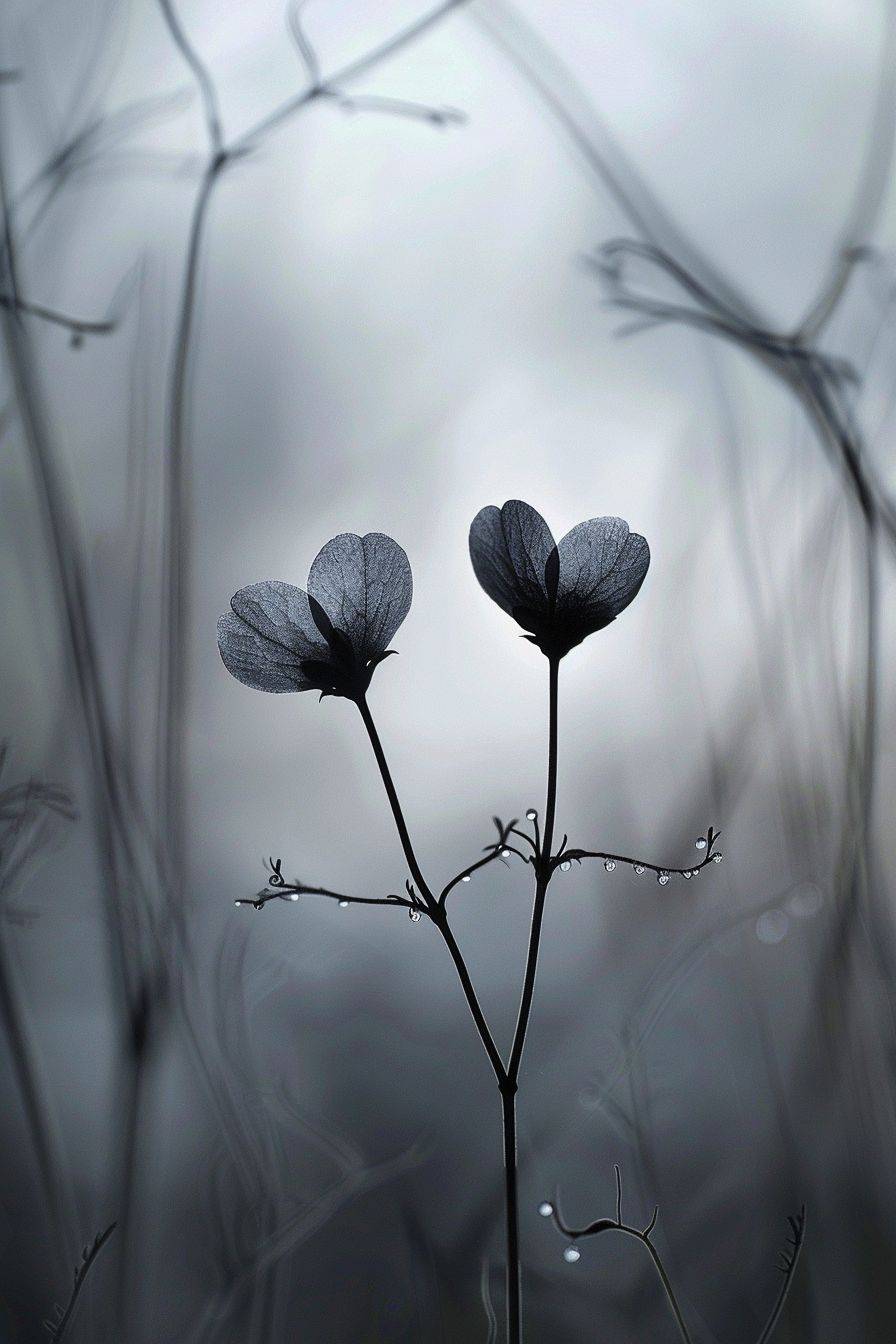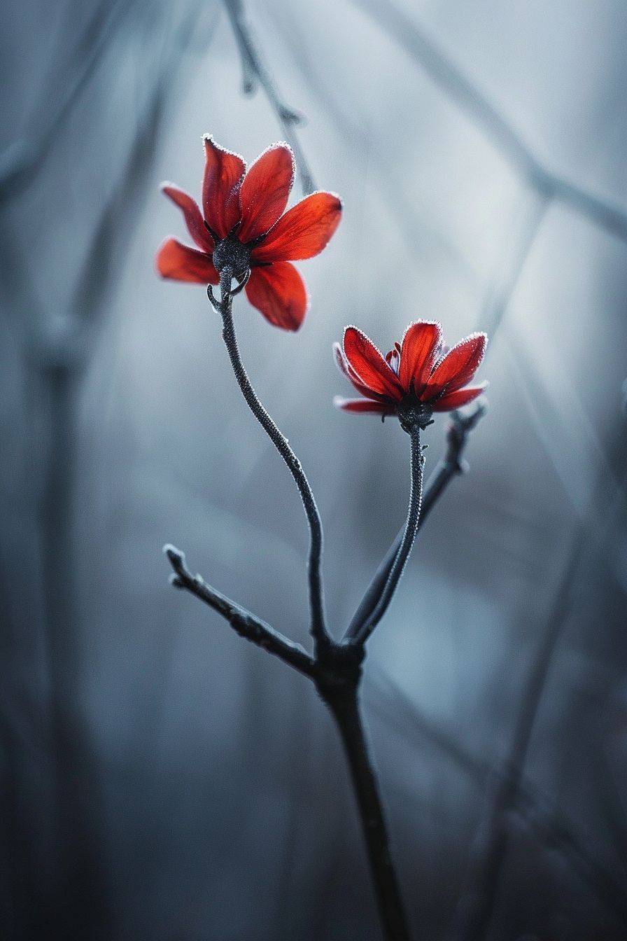 macro photography by Nathan Wirth, winter, details, two flowers touching each other, morning light --ar 2:3