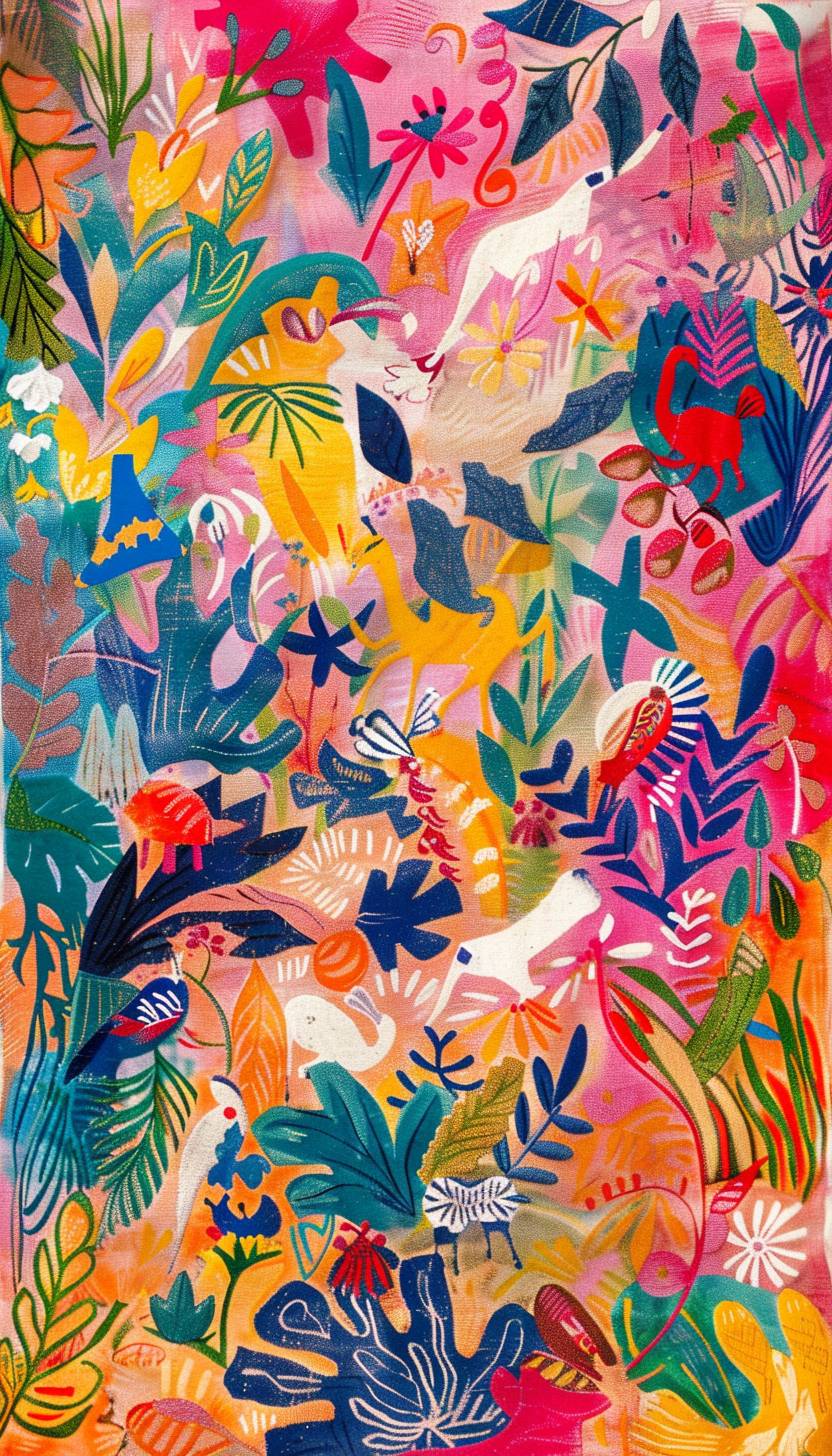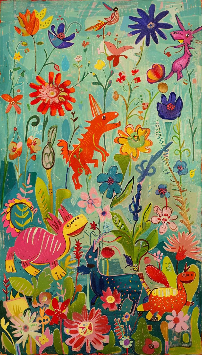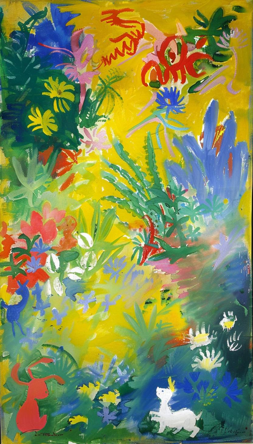 在阳光明媚的草地上嬉戏的神奇生物,亨利·马蒂斯风格